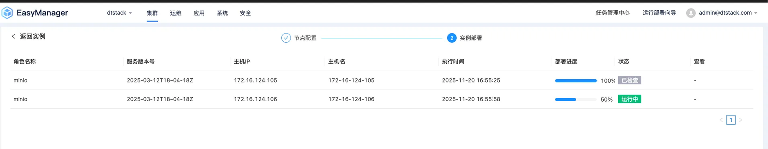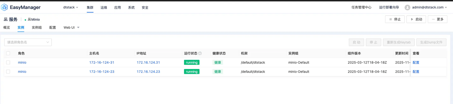 EMR 对等扩容应用导航至服务列表:在主导航栏中,点击 “服务管理”,进入集群所有服务的状态总览页面。定位 Minio 服务:在服务列表中,找到 “Minio” 或 “对象存储” 服务。您可以通过服务状态指示灯确认其当前运行正常。启动扩容操作:点击 Minio 服务行右侧的 “更多” 按钮,从弹出的操作列表中,选择 “添加实例” 。