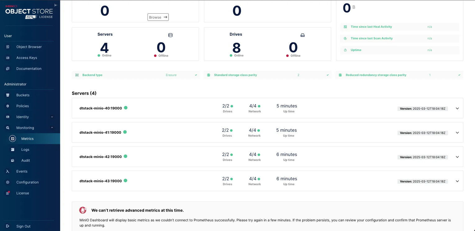 完成扩容后,您可以在 Minio 控制台上直观地看到总可用存储空间的增长,并能够利用新增的容量来创建更多的存储桶(Bucket)或存储更大的对象(Object)