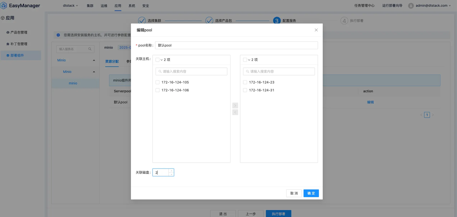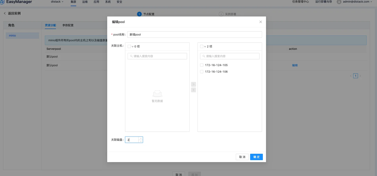 节点池配置与磁盘规划在 EMR 集群部署页面中,用户首先需要进入“节点池”配置模块。在此,您可以创建或选择一个特定的节点池,并将 Minio 服务精准地关联至池内目标计算节点。关键步骤在于对存储资源的规划:您需要明确指定为 Minio 服务挂载的磁盘数量,系统默认为每个选中的节点挂载一定数量的磁盘。