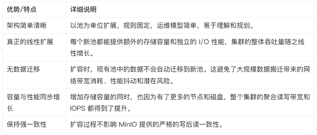 集群扩容 MinIO 最常用、也最核心的扩容就是对等扩容,顾名思义,就是通过向现有 MinIO 集群中添加一个或多个全新的、在架构上完全对等的服务器池,来扩展集群的整体容量和性能。一个服务器池 是由多个 MinIO 节点(服务器)组成的、独立的纠删码组。池内的节点协同工作,为存储在该池中的数据提供数据保护和冗余。在扩容时,我们以整个池为单位进行添加,而不是添加单个节点或磁盘