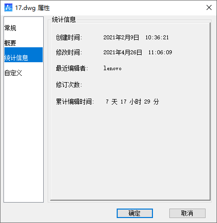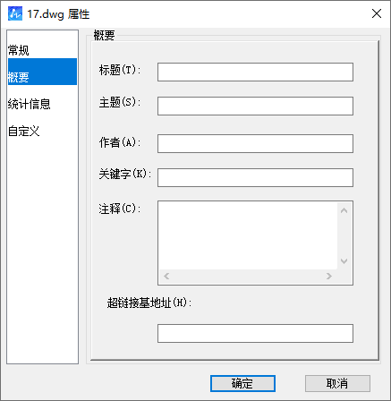 我们可以点击菜单【文件-图纸特性】(【DWGPROPS】命令),可以查看关于图纸文件的信息,部分自定义信息可以编辑修改。