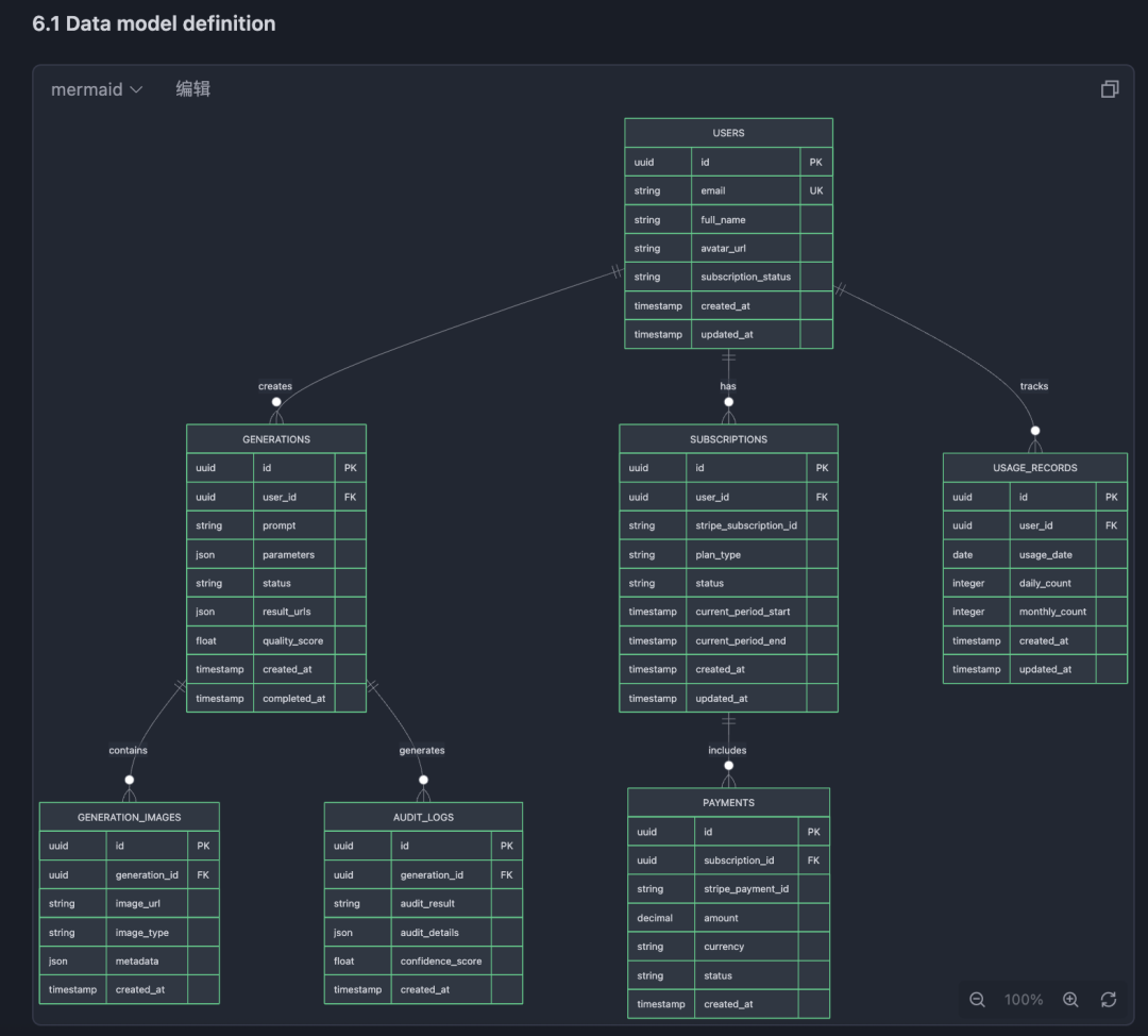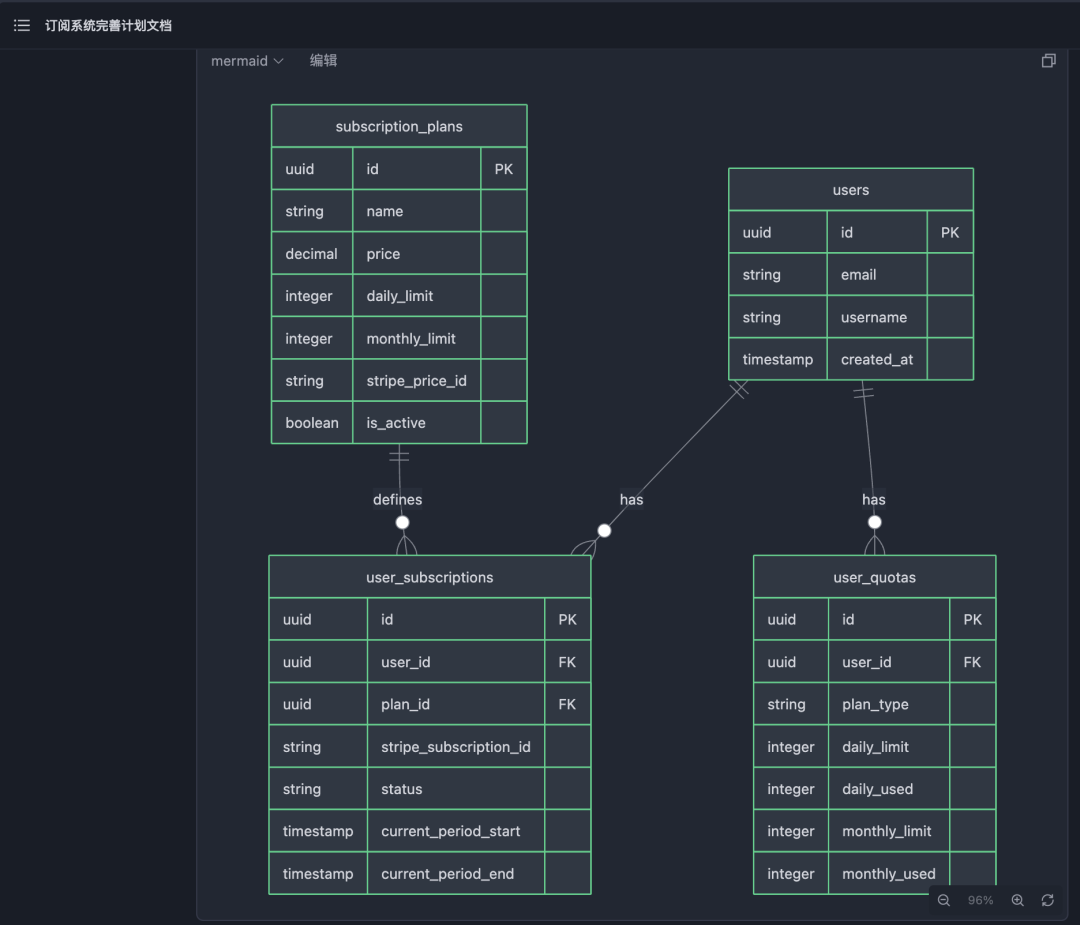 接着让 TRAE 生成 user\_subscriptions 和 subscription\_plans 表 。