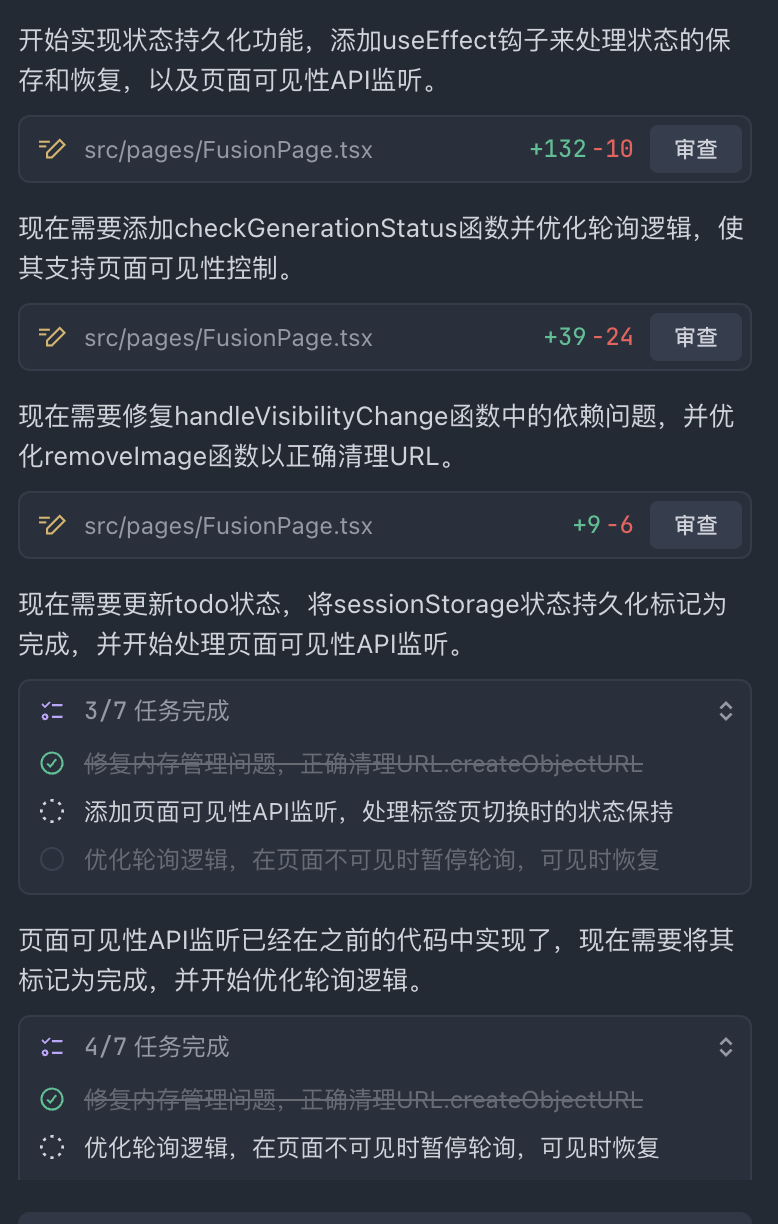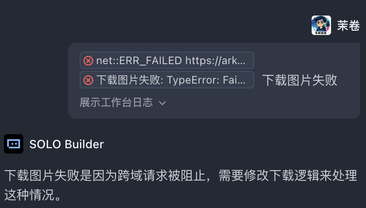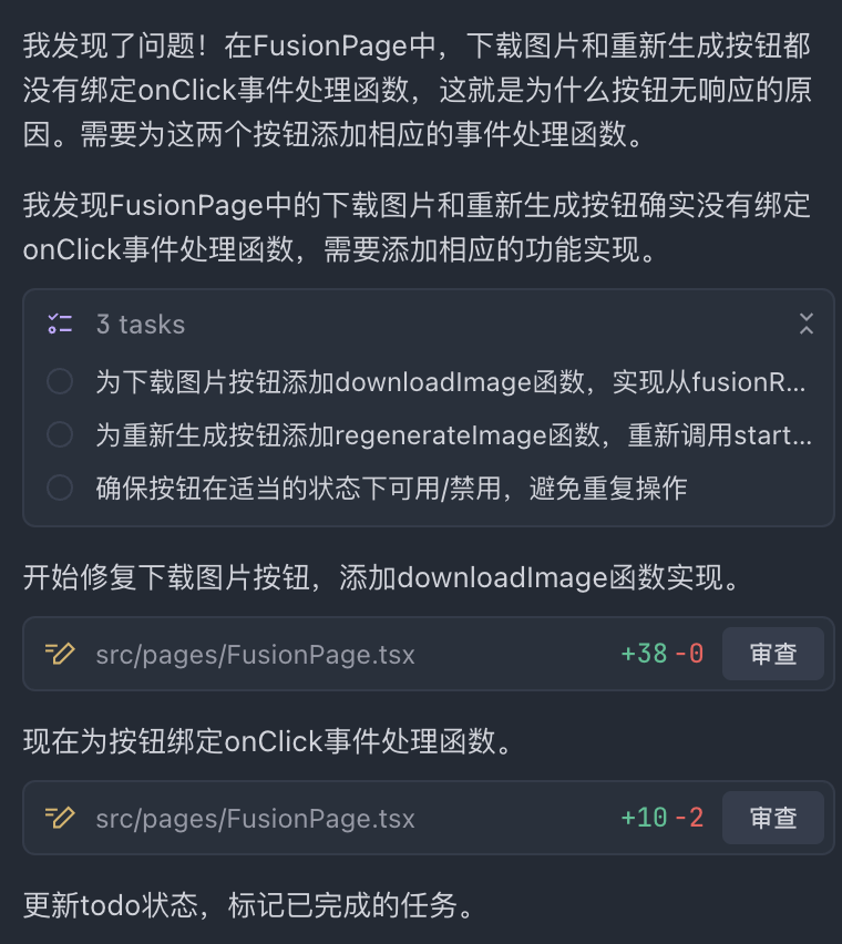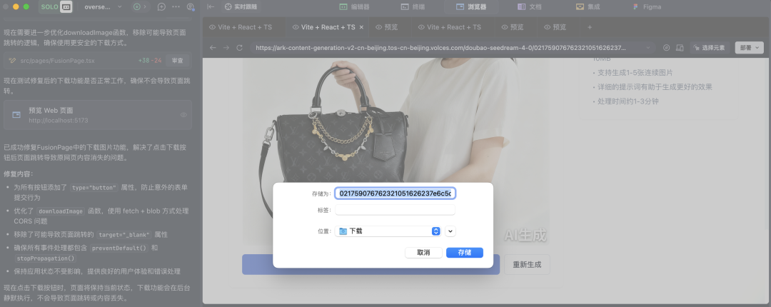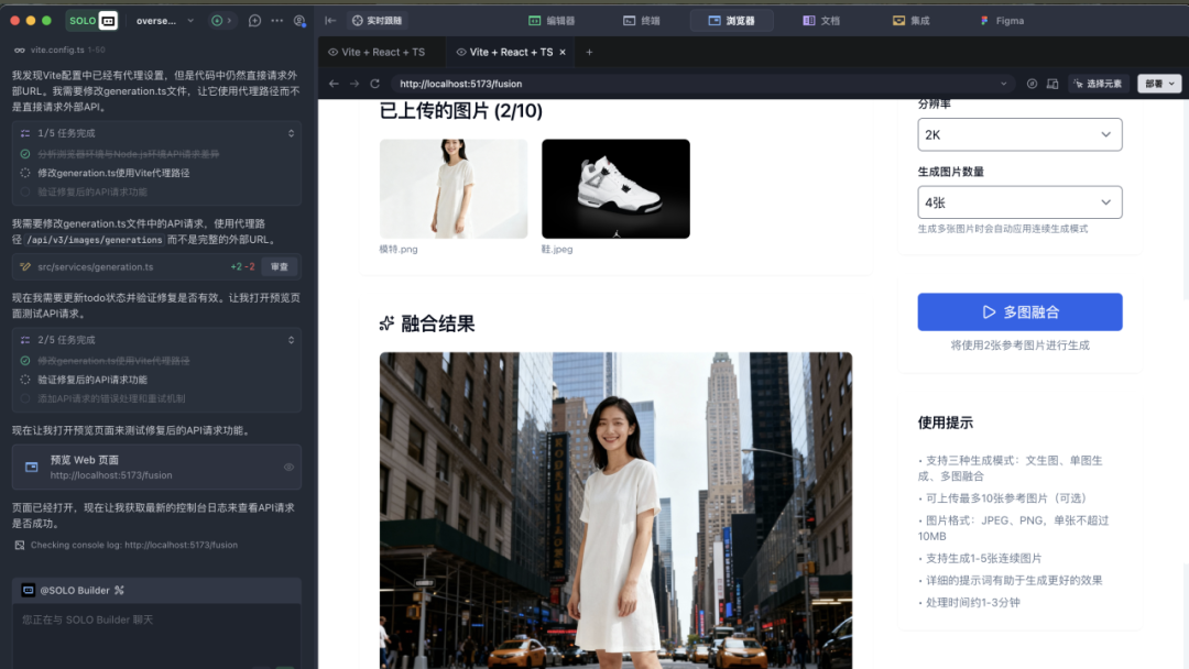 运行了很久之后,基本改完,图片融合生成后,出错,让 TRAE 继续分析。