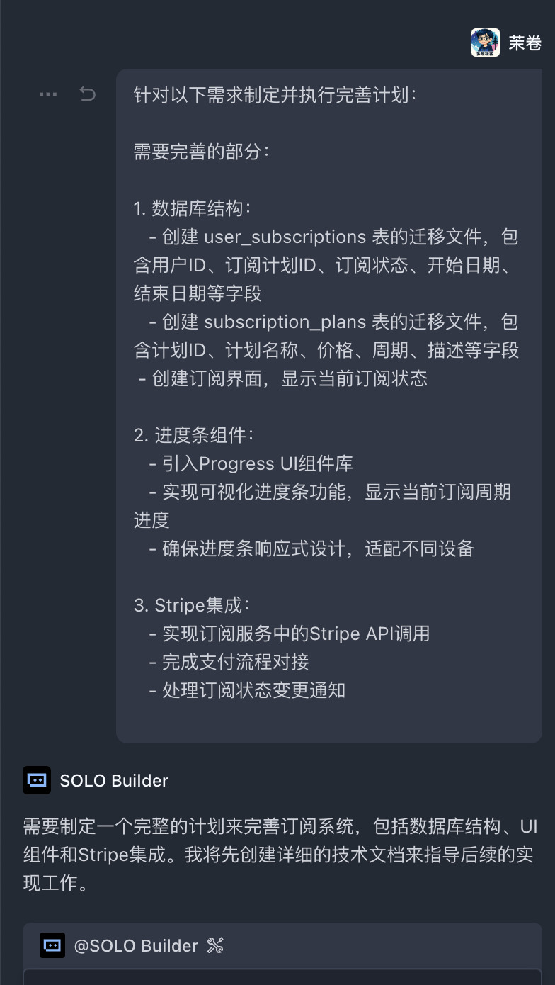 执行中,AI 行动栏中发现它要实现后端代码(Stripe 相关密钥不能暴露到前端),我比较倾向使用 python FastApi 接口,于是让 TRAE 修改后端方案。这个方案应该在项目开始前就确认,前期没有明确后端方案,失误了。