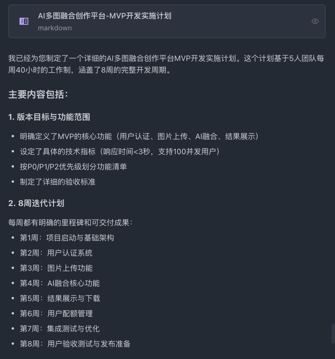 # AI多图融合创作平台 - MVP开发实施计划 ## 1. 版本目标与功能范围 ### 1.1 MVP核心功能需求 **核心价值主张:** 为用户提供基于AI的多图融合创作服务,支持图片上传、智能融合和结果下载。