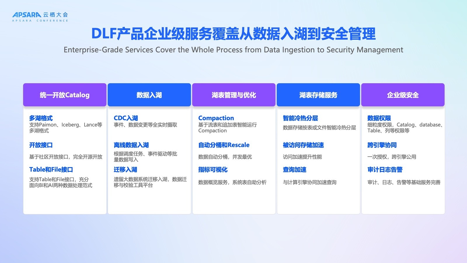 通过一系列重磅升级,DLF 产品以统一开放 catalog 为基础,整体功能覆盖从数据入湖、湖表管与优化、湖表存储服务、企业级安全等丰富功能,让用户离线数据、实时数据、存量系统迁移平滑入湖,同时实现更高效的湖表存、管、优化,真正实现安全开放可靠的湖仓平台。