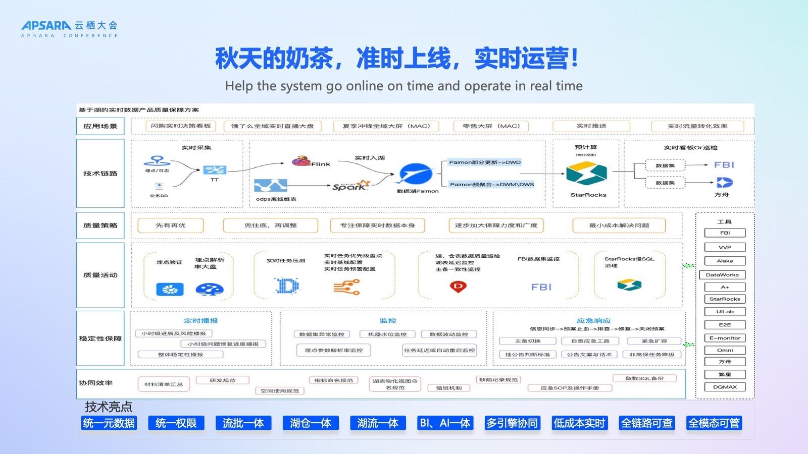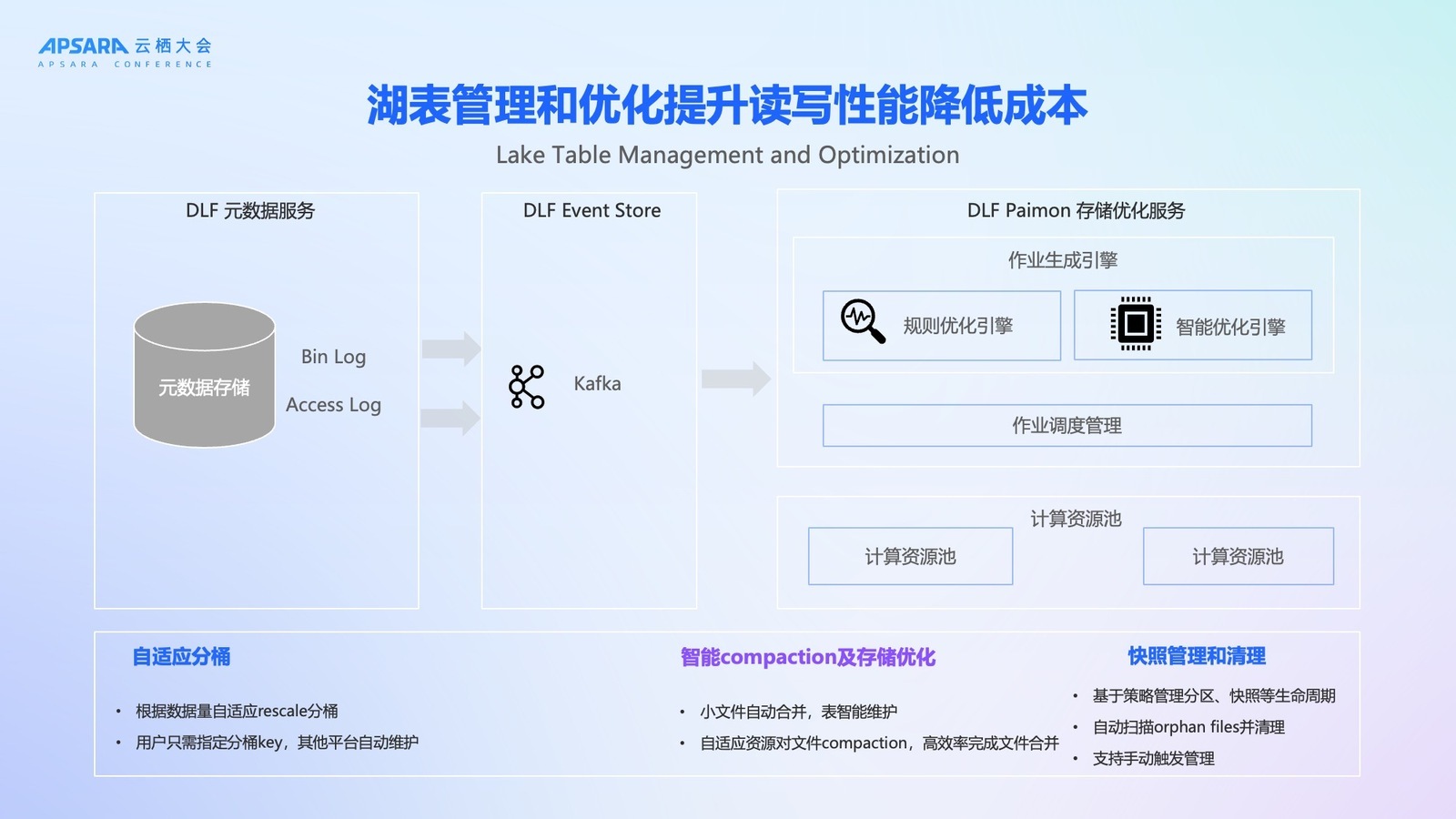第二个升级对于 catalog service 的管理,DLF 升级到 Omni Catalog,我们面向全模态可以提供 Iceberg、paimon、lance、object table 及 file 相关的管理,对用户来说有一个非常重要的变化在于原来的 Lakehouse 架构可能只能管 Table,DLF 架构下不仅仅可以管理 Table 数据,还可以管理全模态的数据,意味着 tables 和 files 都可以统一管理。paimon 是实时湖仓最领先的一套方案,同时我们也兼顾了用户存量的系统架构需求,也可以支持 Iceberg 这样的湖仓架构,对于用户来说可以做到更灵活和多样的选择。