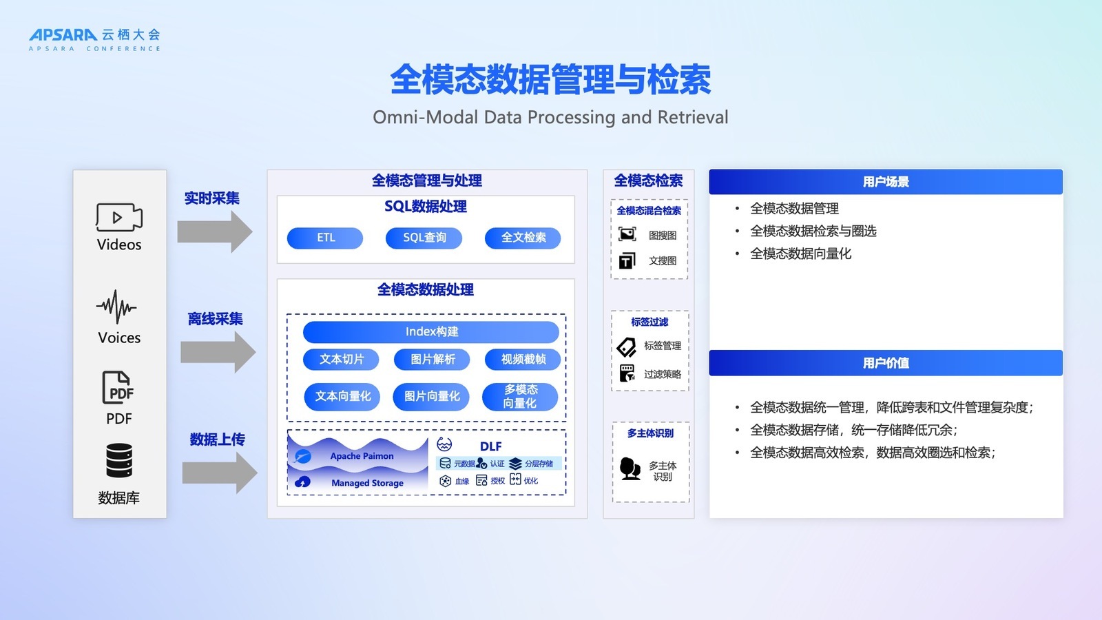 DLF 3.0 最引人注目的创新在于全模态数据支持。随着 AI 时代的到来,大家听到更多的是非结构化数据该怎么管,非常多的视频、图片数据该如何管理,该如何圈选我的 DataSet。通过 DLF 平台可以将非结构化数据,包括视频、音频、PDF 进行管理,同时原来这套结构化数据也可以进一步接入。通过实时采集或者离线采集或者数据上传的方式接入到 DLF 平台,同时通过 Lance 这样一套底层能力来构建全模态数据的存储、管理以及后续承载 embedding 数据接入的能力。