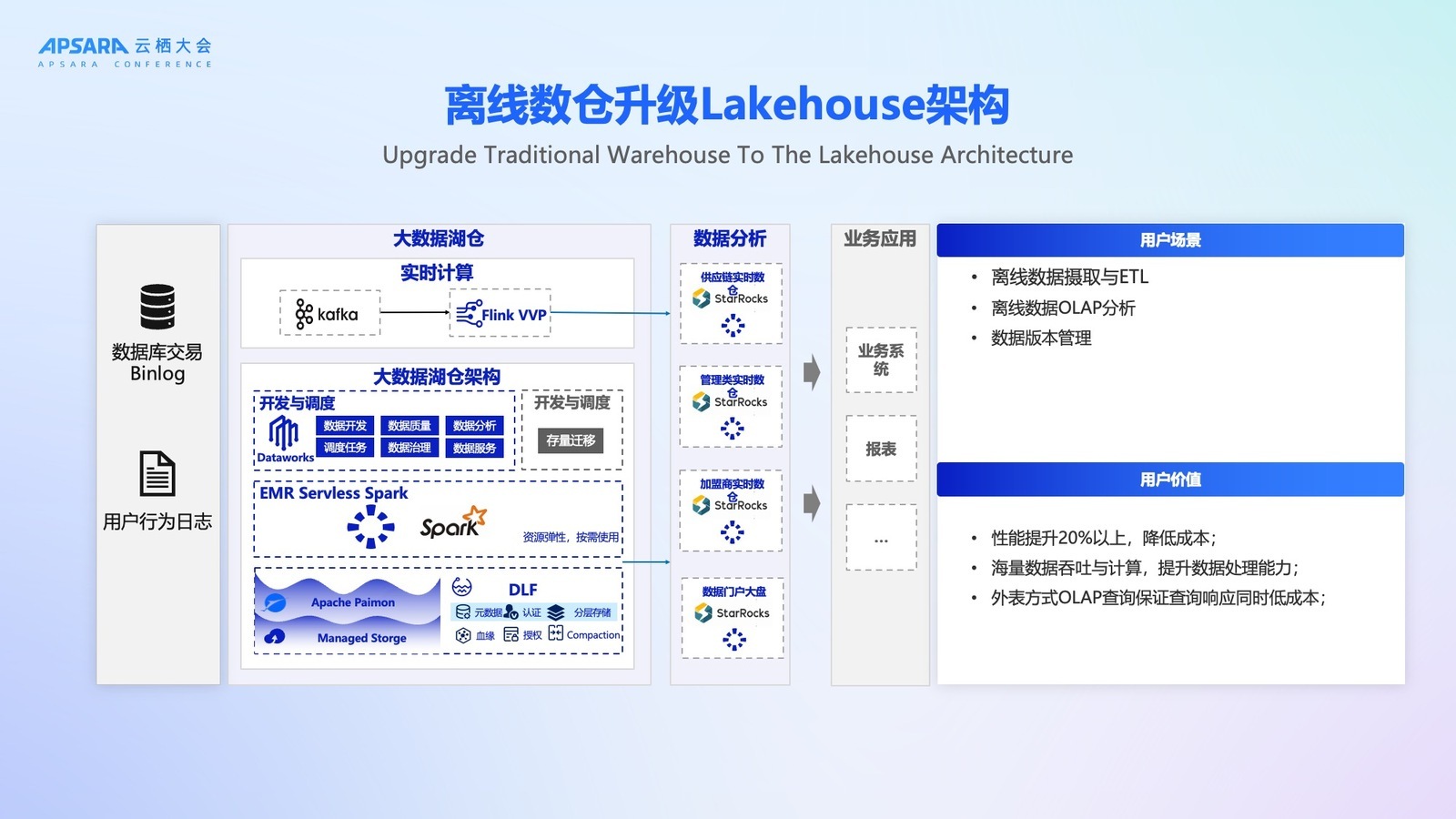 在 2025 年秋季,阿里云 DLF 3.0 成功支撑了阿里巴巴集团闪购业务的准时上线。该业务对数据实时性要求极高,需在秒级内完成用户行为分析、库存预警与营销决策。因为在去年阿里巴巴集团就做了 Alake 项目,基于 Lakehouse 架构构建了整个平台,所以基于 DLF 可以让流批做更好地融合。面向用户场景会有 BI 场景、AI 场景,这套架构可以很好地兼容两种场景的使用,灵活选择多种引擎应对业务方的需求。