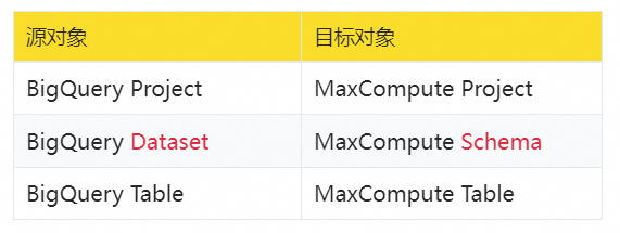因此迁移到 MaxCompute,继续保持三层模型:Project -- Schema -- Table