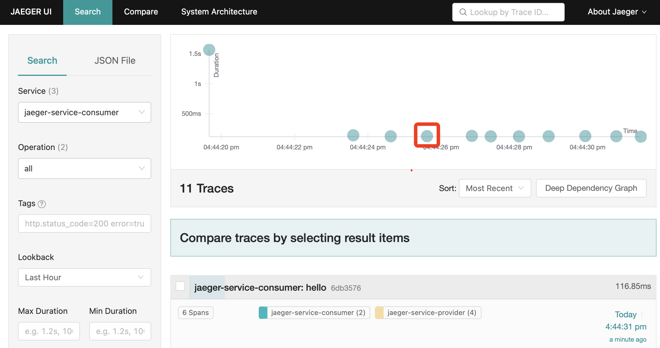 打开 jaeger 的 web 页面,可以看到多次请求的 trace,咱们随机选择一个,鼠标点击下图红框中的圆点: