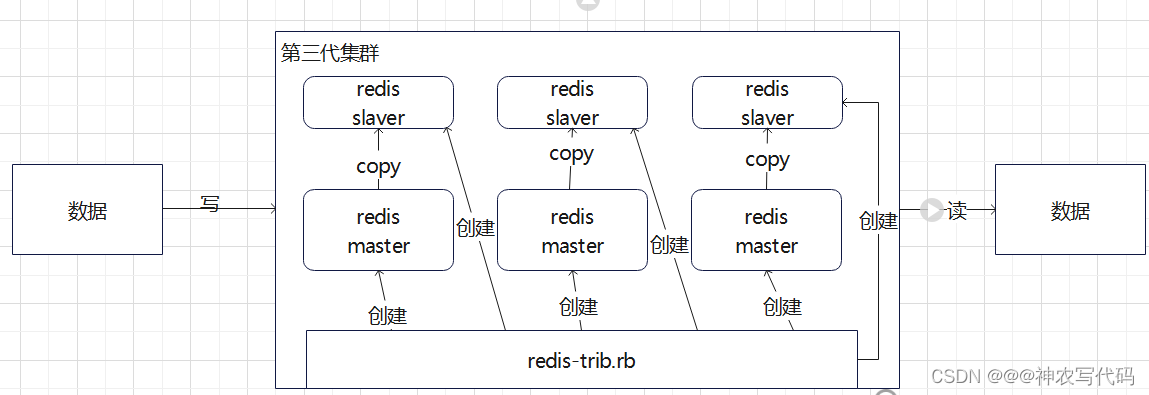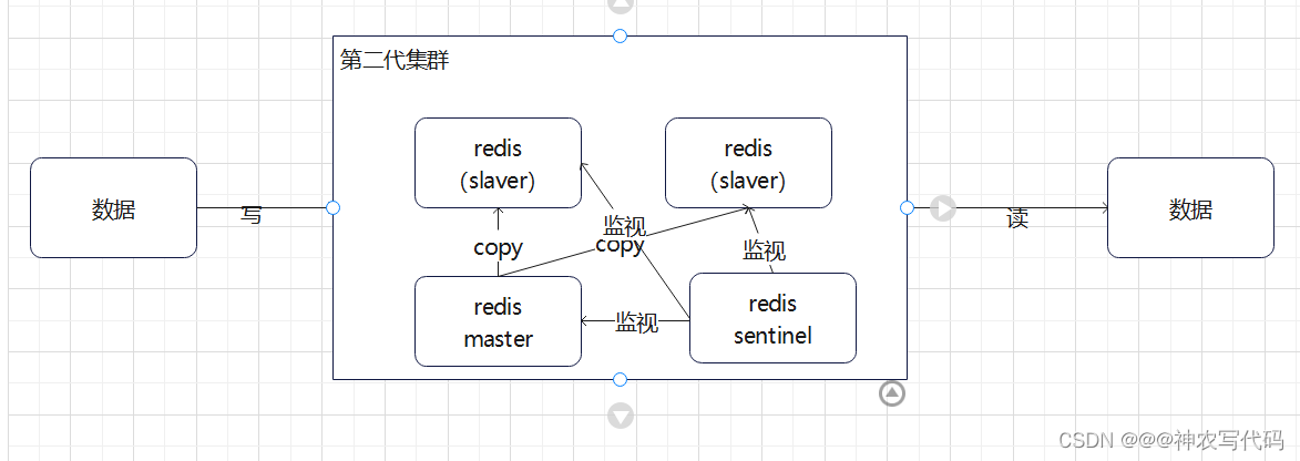 第二代集群比第一代集群多了一个 sentinel 监视的角色,当主节点宕机后,sentinel 会从多个从节点中选择一个为主节点。
