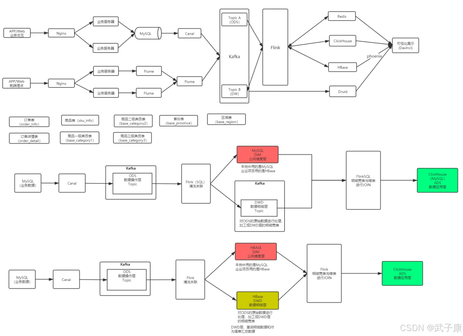 如上图所示,数据实时写入 HBase,实时的数据更新也在 HBase 完成,为了应对 OLAP 需求,我们定时(通常是 T+1 或者 T+H)将 HBase 数据写成静态的文件(如:Parquet)导入到 OLAP 引擎(如 HDFS,比较常见的是 Impala 操作 Hive)。这一架构又能满足随机读写,又可以支持 OLAP 分析的场景,但是有如下缺点: