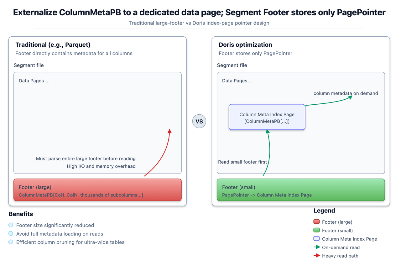 为此,Doris 在 Segment 文件格式层进行了关键优化:将列元数据从 Footer 中剥离,独立存储于专用的数据页(可理解为元数据索引页)中,Footer 仅保留指向该页的轻量指针。读取时先加载精简 Footer,再按需定位并加载所需列元数据。这种 Externalize Meta 的设计,从根本上避免了宽表场景下的元数据膨胀问题,使列裁剪始终保持高效。