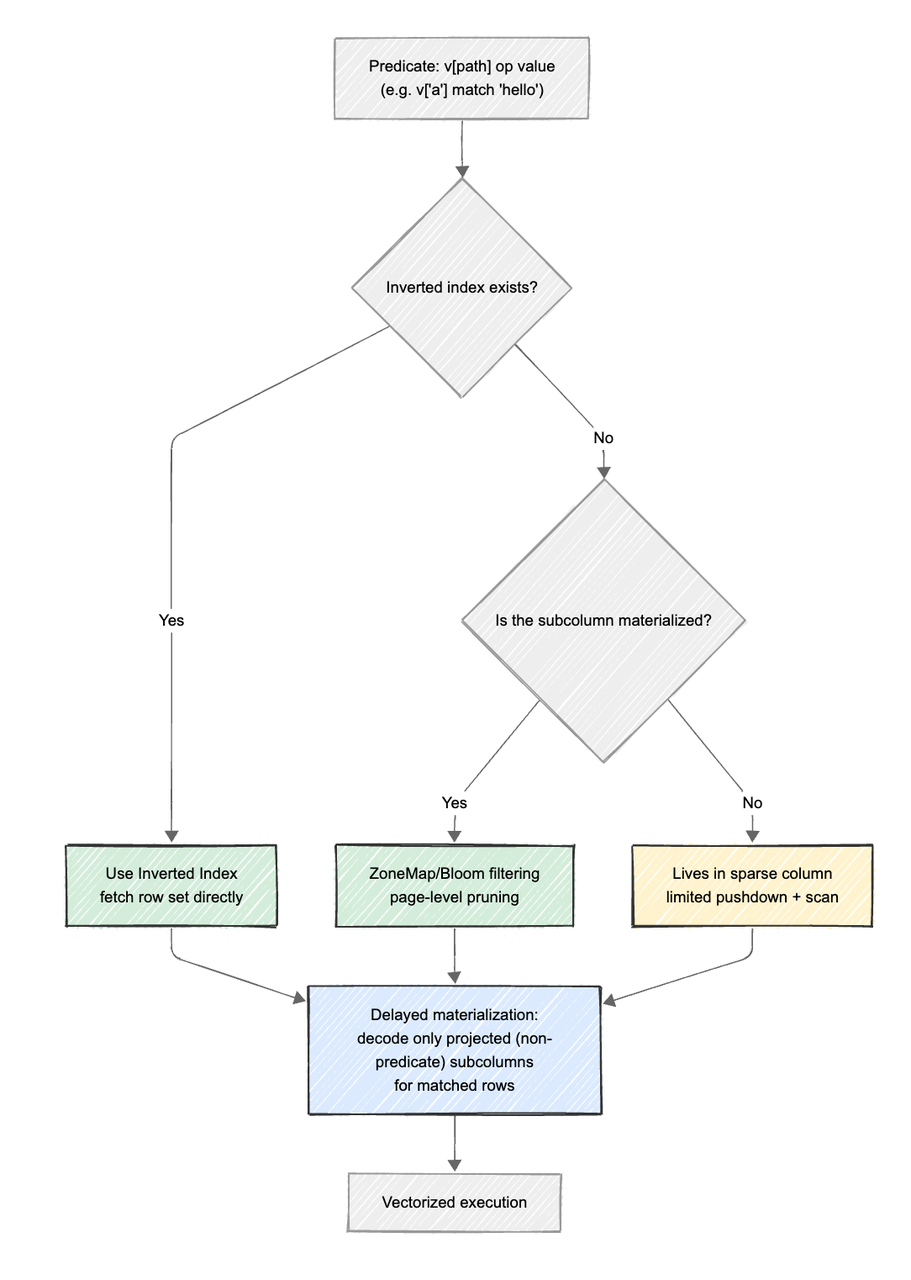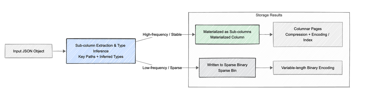 v['user']['id']查询 ,但查询引擎可以直接访问到已物化的user.id子列,充分利用列存和向量化执行的性能优势。稀疏列 :对于出现频率极低或结构复杂的稀疏子列,不为其创建独立子列以避免列爆炸。相反,这些数据会被高效组织在一个类 JSONB 的二进制“稀疏”列中,保留完整数据而不为罕见字段额外建列。