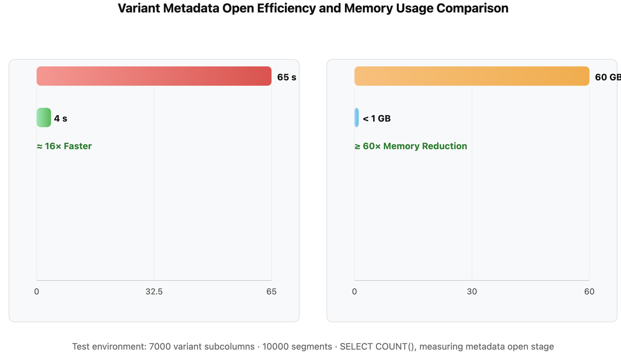 以下是关于 VARIANT 元数据打开效率的测试对比(环境设置包含 10,000 个 Segment,每个 Segment 拥有 7,000 个 JSON Path,且均已物化为子列):