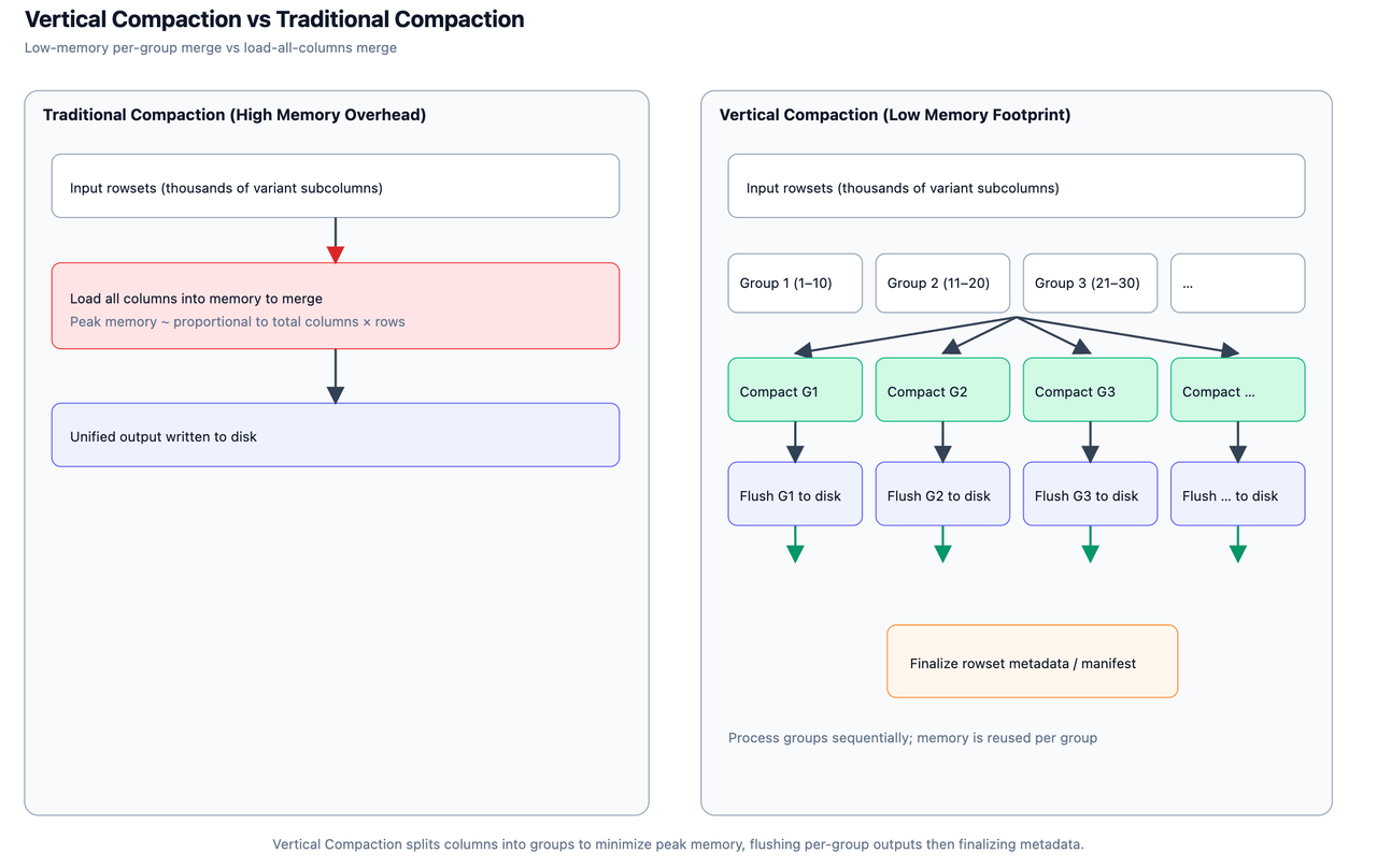 为此,Doris Variant 引入子列级 Vertical Compaction,将单次 Compaction 拆分为按列分组的多轮合并。每轮仅加载部分列组(如 10 列),逐步完成全量合并。此举带来两大核心改进: