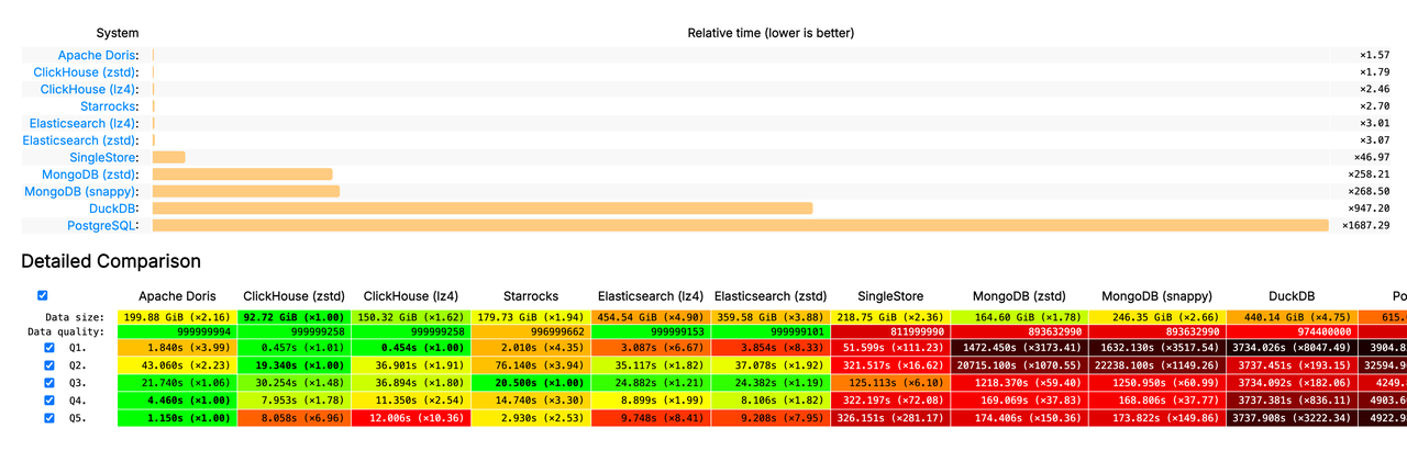实测表明,在同等硬件条件下,Doris 的日志聚合查询性能相比 Elasticsearch 快 2–3 倍,写入延迟降低 80% 以上,减少约 70–80% 存储空间。