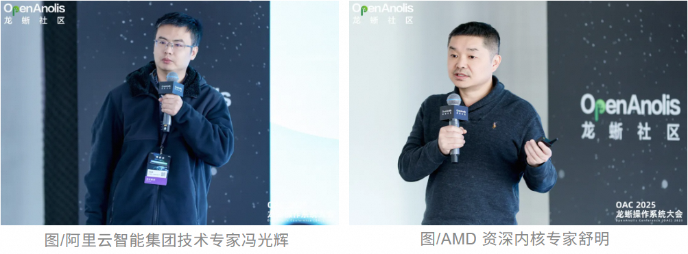 阿里云智能集团技术专家冯光辉、AMD 资深内核专家舒明联合分享了《从主线到龙蜥的内核创新,驱动下一代 AMD EPYC 计算平台》。冯光辉介绍了 AMD Genoa、Turin 等平台在龙蜥操作系统中的适配现状,重点展示 INVLPGB、Bus Lock Trap、IBS 等高阶能力的落地情况,并分享了未来在 I/O 加速、SEV-SNP 机密计算等方向的社区支持计划。舒明则全面分享了 AMD EPYC 在开源生态中的技术投入与创新成果,涵盖从 Linux Kernel 上游社区的前沿开发进展到龙蜥社区的产品化支持;也深入解析了 AMD 工程师在 Linux Kernel Upstream 社区的最新补丁进展,包括 SDCI、PML、SDXI、vIOMMU 等关键特性,探讨其在实际应用中的价值与对下一代 AMD CPU 的支持。