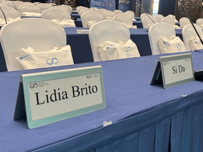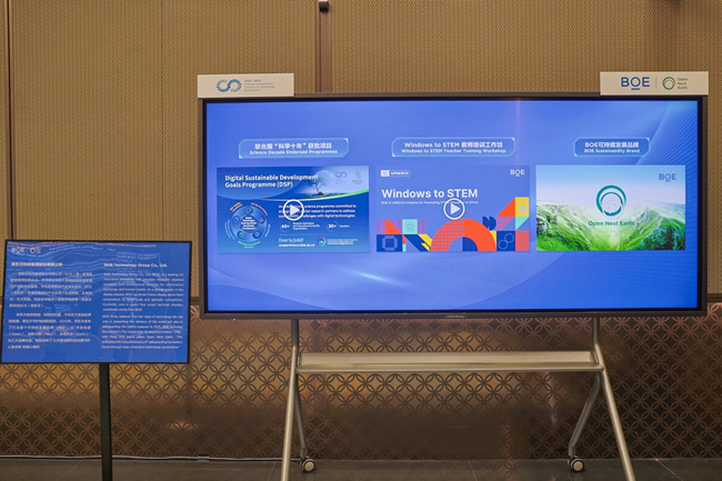 作为一家领先的物联网创新企业,BOE(京东方)自创立之初一直以科学造福人类,这与《2024-2033 年科学促进可持续发展国际十年》倡议(简称“科学十年”倡议)所倡导的“利用全球科学力量,共同打造一个可持续未来”的方向高度契合。在“科学十年”框架内,BOE(京东方)与 UNESCO 汇聚多方力量,于 2025 年共同发起“Windows to STEM”倡议,以“科学普及与教育”为切入点,向非洲地区引入先进数字化教学设备,并选定一批核心培训师进行集中培训,聚焦非洲 STEM 教育能力建设。STEM 教育是科学(Science)、技术(Technology)、工程(Engineering)和数学(Mathematics)的综合教育模式,旨在培养学生的创新能力和实践能力。今年 8 月,首届“Windows to STEM”教师培训工作坊已在肯尼亚内罗毕成功举办,BOE(京东方)将智慧教育设备与课程资源带入非洲,助力当地教师开展编码与 AI 教学,以科技打破教育壁垒,以可持续的方式培育本土师资,共建开放的全球教育资源平台。值得关注的是,2025 年是 BOE(京东方)与 UNESCO 基于“科学十年”倡议开启合作的首年,年底还将与 UNESCO、中国科学技术协会、肯尼亚教育部等伙伴共同举办项目启动仪式,并以试点成果为基础,将“Windows to STEM”推广至更广阔的非洲地区。而在“科学十年”分会现场,BOE(京东方)本着“科技办会”和“绿色办会”原则,通过创新的多触点“万境屏”全面展现了联合国“科学十年”项目介绍、肯尼亚教师培训工作坊的教学成果,以及 BOE(京东方)刚刚发布的可持续发展品牌“ONE”等相关视频,给与会者提供更为直观的感受。不仅如此,此次边会的桌签也替换成了 BOE(京东方)智慧电子桌牌,倡导实现“无纸化”绿色低碳理念。