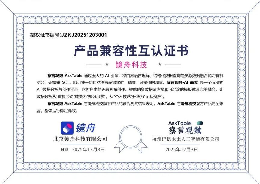 镜舟科技与察言观数(AskTable)完成产品兼容互认,携手开启智能数据分析新篇章