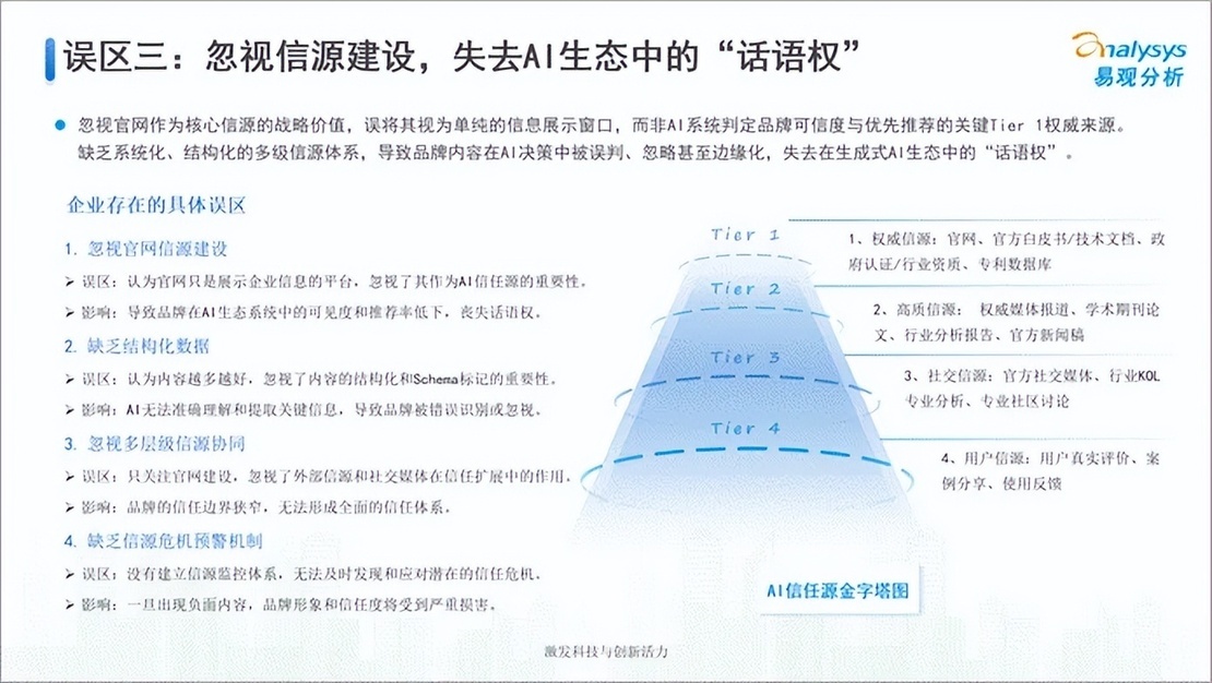 在实施 GEO 策略时,企业常忽视信源建设,未能充分认识到官网作为 AI 信任源的重要性。这种误区导致品牌在 AI 生态系统中的可见度和推荐率降低,从而失去在 AI 生态中的“话语权”。企业需要建立系统化、结构化的多级信源体系,以确保品牌内容在 AI 生成的答案中被准确理解和引用。