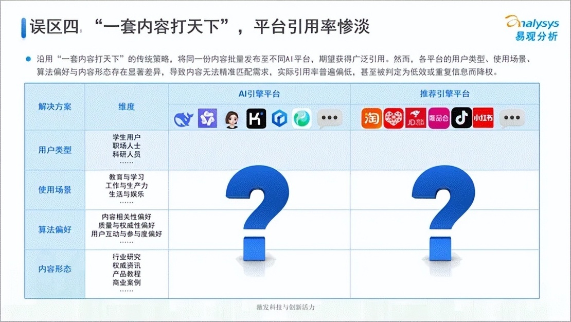 在 GEO 的实践中,企业常陷入“一套内容打天下”的误区,即试图用同一套内容策略应对所有 AI 平台,期望获得广泛引用。然而,不同平台的用户类型、使用场景、算法偏好和内容形态存在显著差异,这种一刀切的做法导致内容无法精准匹配各平台的需求,实际引用率普遍偏低,甚至可能因内容重复或不相关而遭到降权。