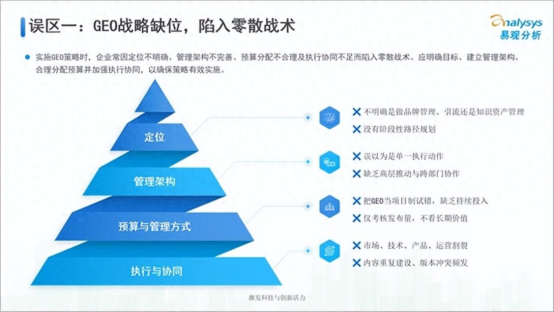 在实施 GEO 策略时,企业常因定位不明确、管理架构不完善、预算分配不合理及执行协同不足而陷入零散战术。这些问题导致企业无法有效实施 GEO 策略,从而无法确保策略得到有效执行和实现预期效果。