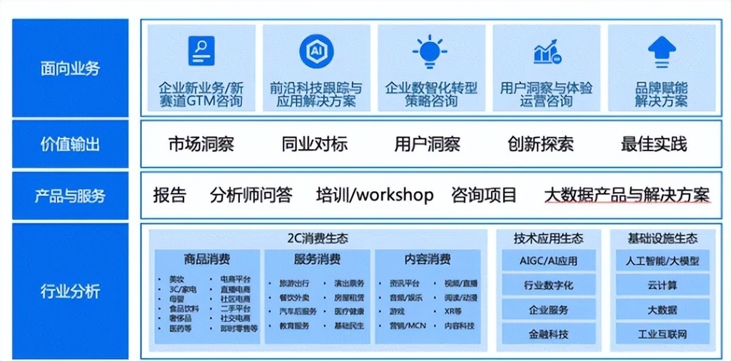 易观汇聚资深行业与商业分析师、数据分析师以及咨询顾问团队,帮助行业企业在数字化业务与应用等方面进行发展现状对标,参照最佳实践,形成数字化业务发展策略,助力企业打造卓越的数字化业务能力,完成面向数智化时代的转型,从激烈的市场竞争当中脱颖而出。