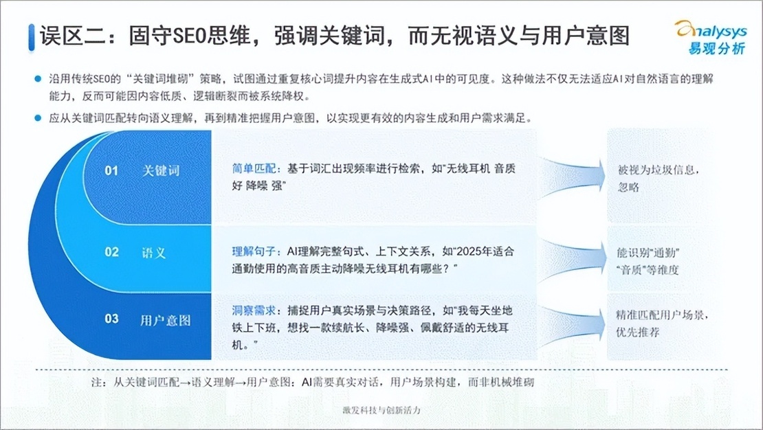 在 GEO 的实施过程中,企业往往固守传统的 SEO 思维模式,过度强调关键词的使用,而忽视了语义理解和用户意图的重要性。这种做法不仅无法适应 AI 对自然语言的理解能力,反而可能因内容质量低、逻辑断裂而被系统降级。企业需要从关键词匹配转向语义理解,再到精准把握用户意图,以实现更有效的内容生成和用户需求满足。