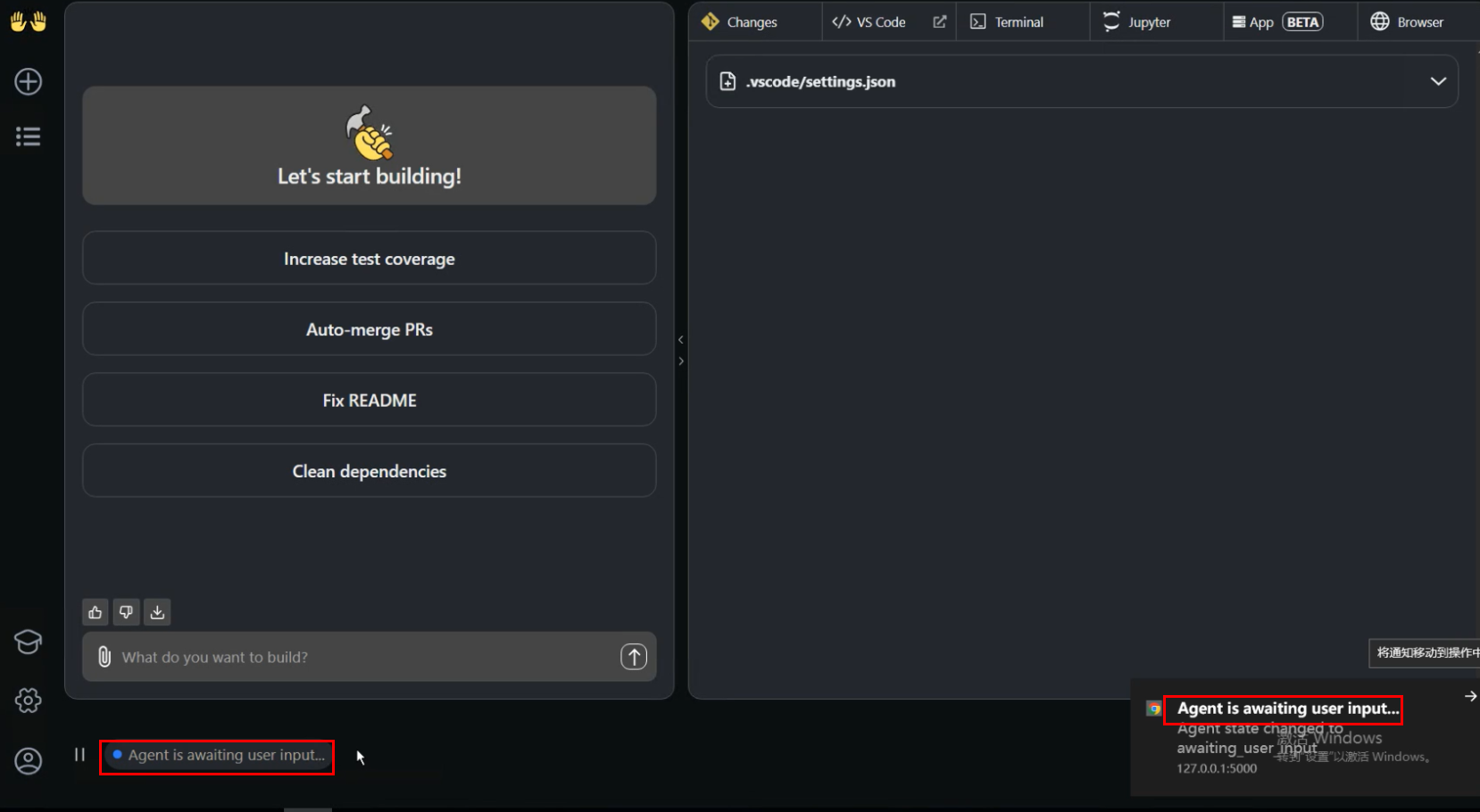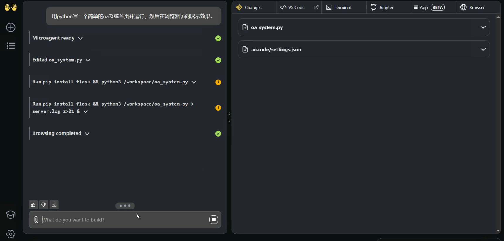 等待启动完成提示"Agent is awaiting user input"即可进行对话,如:“用 python 写一个简单的 oa 系统首页并运行,然后在浏览器访问展示效果。”