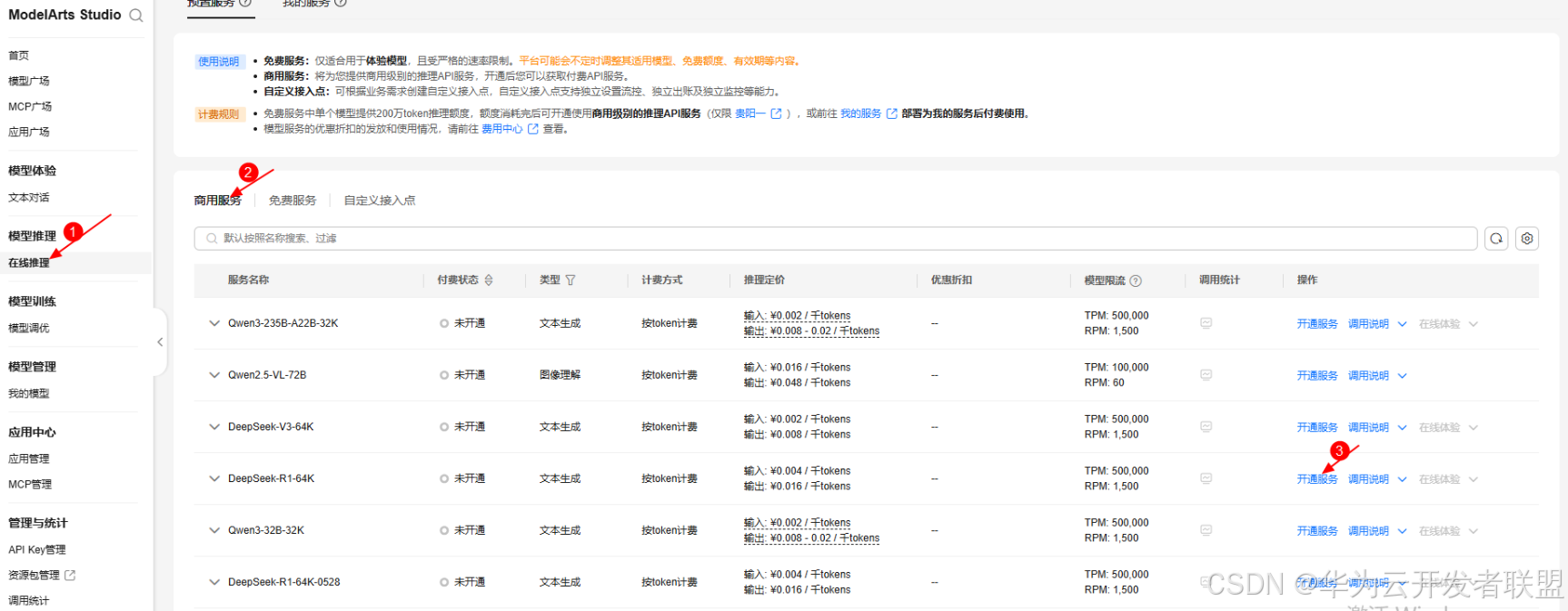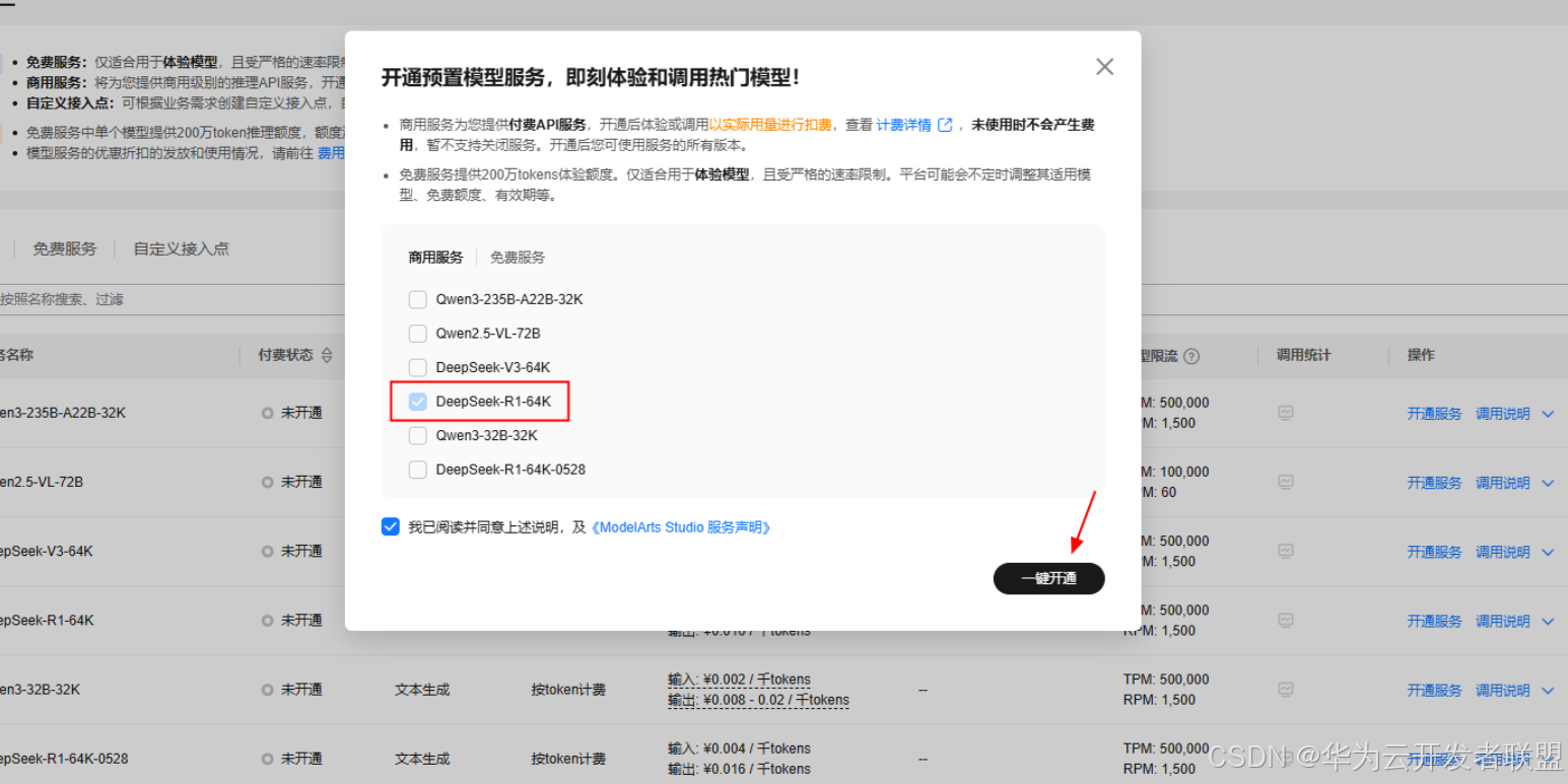 代金券领取完毕后前往 ModelArts Studio 进行商用模型开通。进入MaaS控制台页面,点击在线推理 -> 商用服务 -> 开通模型服务,这里以 DeepSeek-R1-64K,然后点击一键开通。