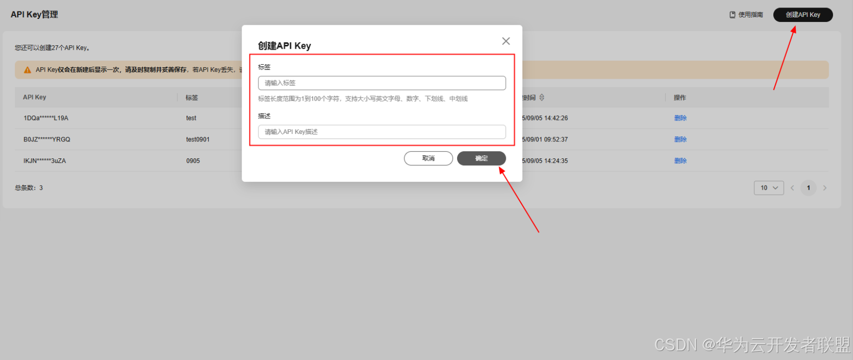 点击 API Key 管理,进入页面后,点击右上角创建 API Key,标签和描述可以自定义,输入完毕后点击创建。(注意:创建好的 API Key 只会显示这一次,请妥善保存)