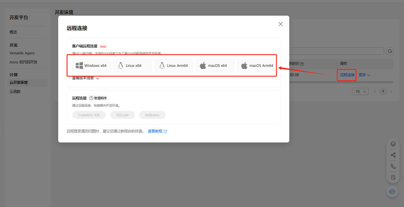 云开发环境创建后,点击远程连接,下载本地环境对应的客户端,这里以 Windows x64 环境为例。