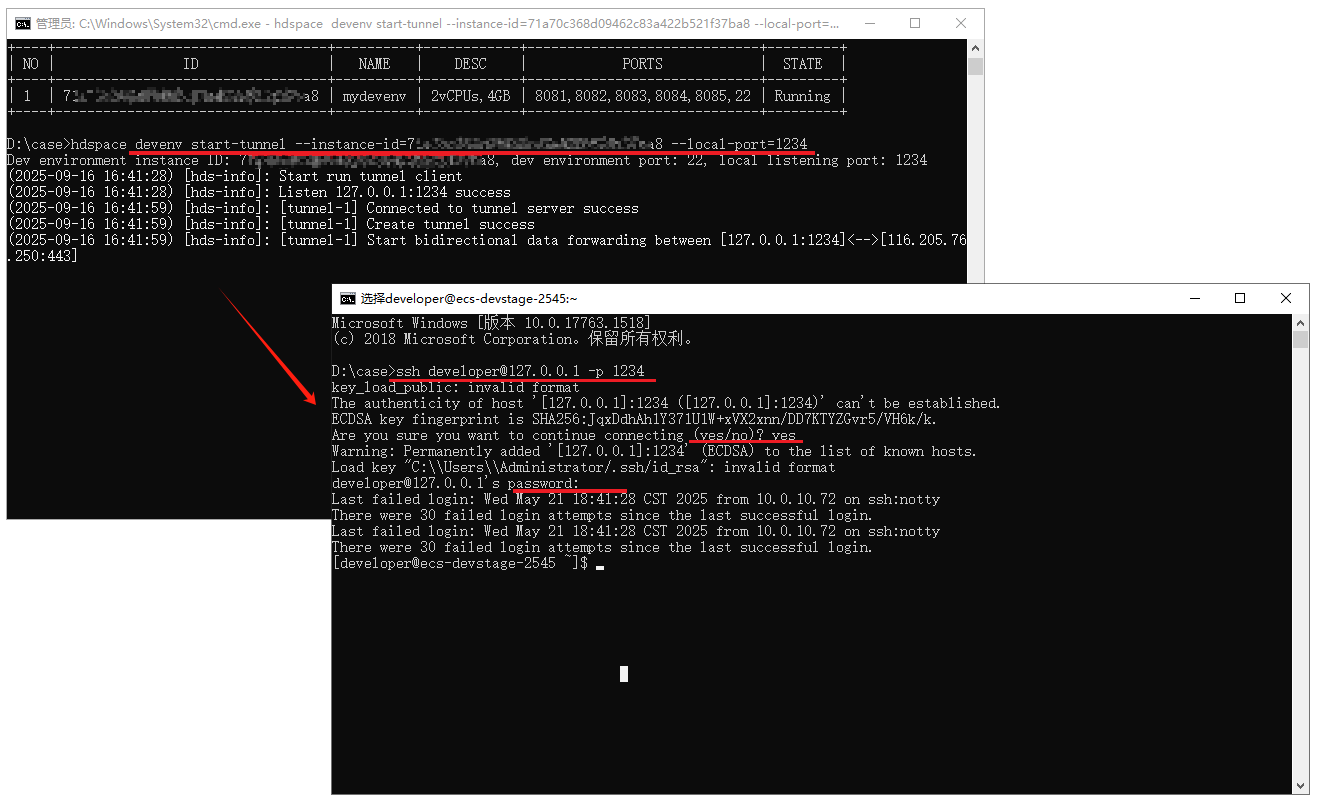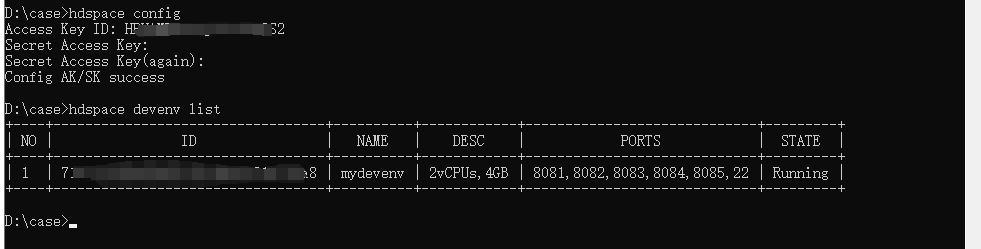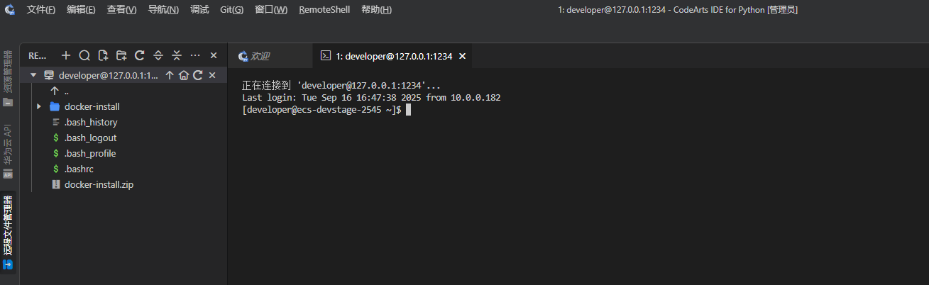 *注意:由于使用 cmd 终端命令窗口会频繁断开重连,可以参考《本地CodeArts IDE基于华为开发者空间云开发环境完成小游戏开发》案例的“1. 下载 CodeArts IDE 并安装 RemoteShell 插件”和“2. 连接云开发环境”步骤实现 CodeArts IDE for Python 连接云开发环境。