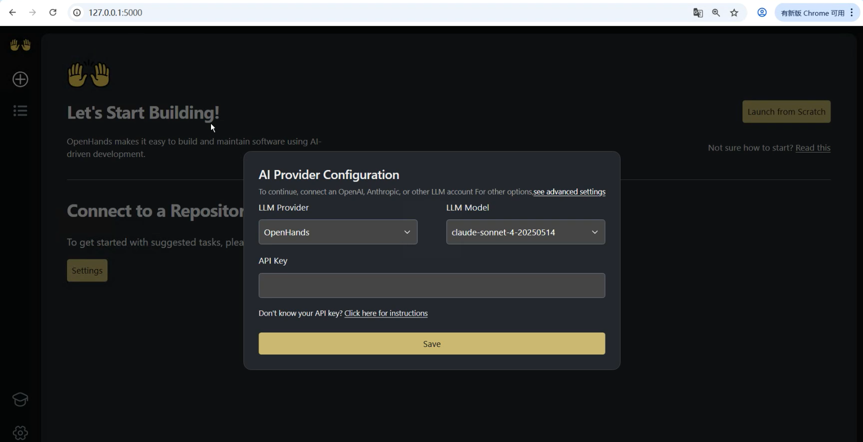 以上步骤都完成后,我们就可以在本地浏览器访问http://127.0.0.1:3000访问OpenHands图形界面。