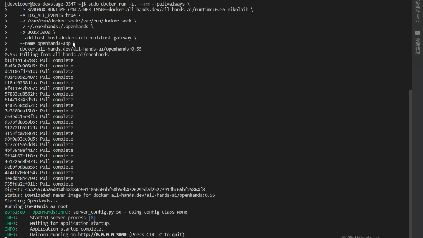 运行服务。这里端口映射选择本地的 8085 端口,保证在创建云开发环境时开放端口范围内,以便后续对云开发环境端口创建隧道,访问 OpenHands 图形界面。
