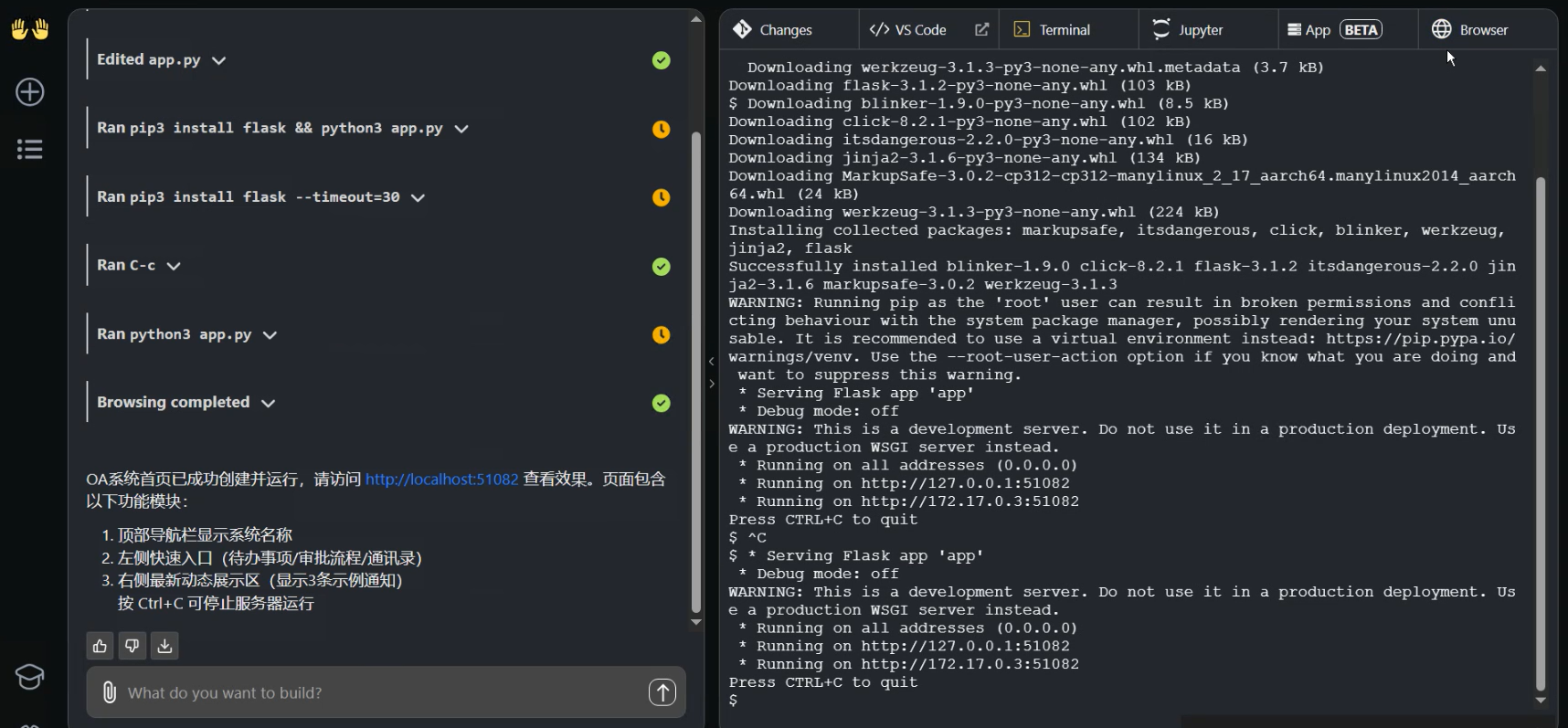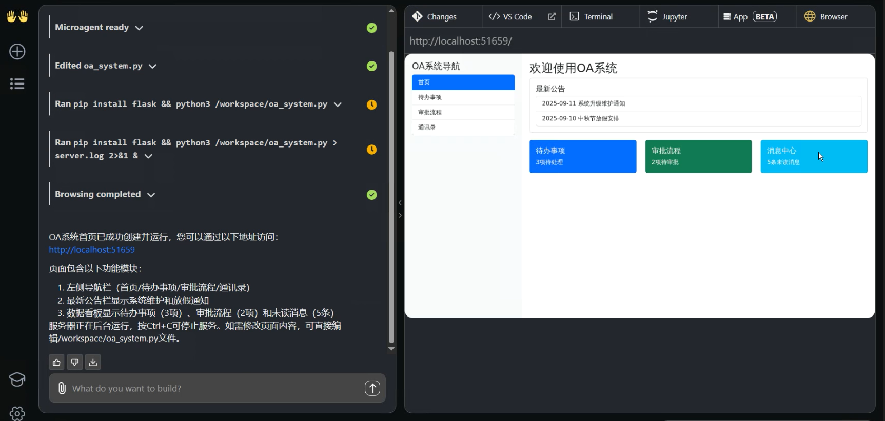 最后可以在 Browser 看到生成的 OA 系统首页效果。(如果出现不成功情况可以重复提问)
