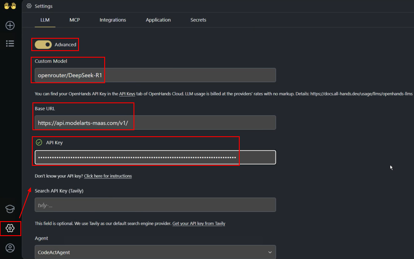 接入前面开通的 MaaS DeepSeek-R1 模型,在 OpenHands 图形界面点击左下角设置,在 LLM 配置页,开启高级配置并配置模型信息。配置参考: