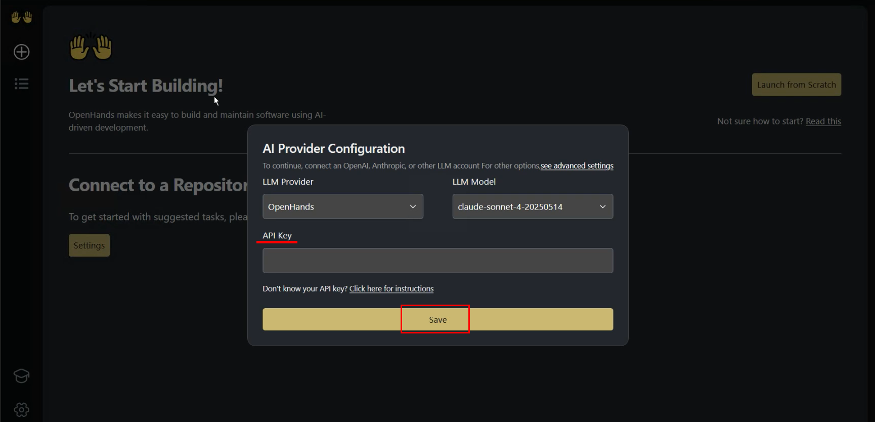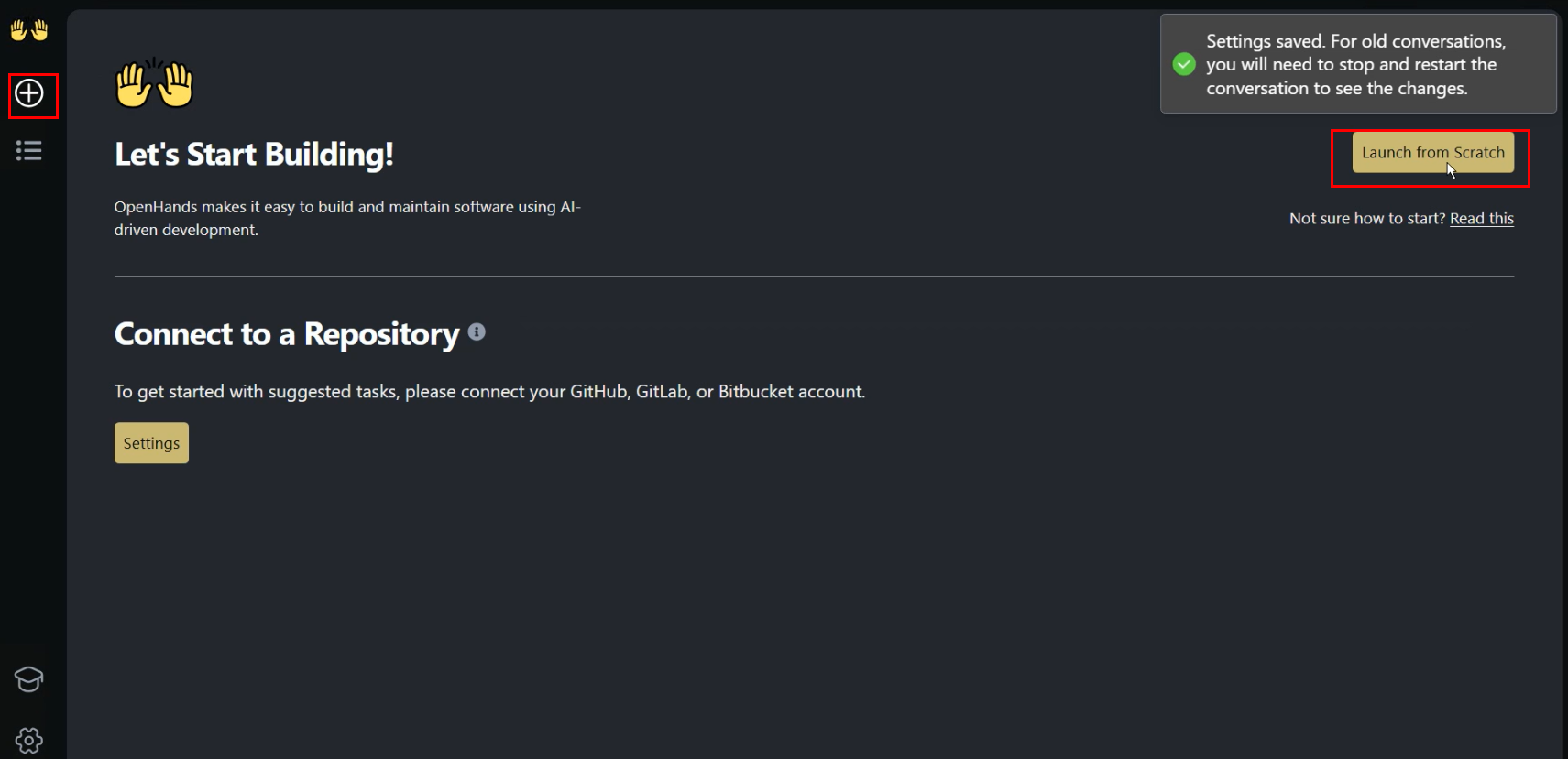 模型配置完成后,回到主页,点击 Launch from Scratch 开启一个新的对话。