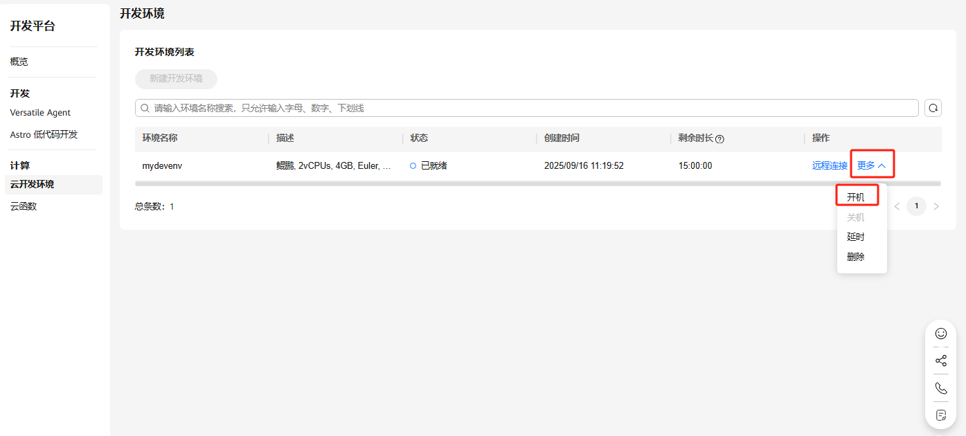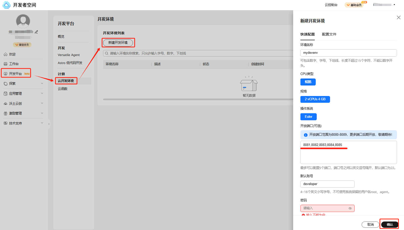 登录华为开发者空间,进入开发平台-云开发环境,点击新建开发环境参考以下参数配置创建,点击确定。
