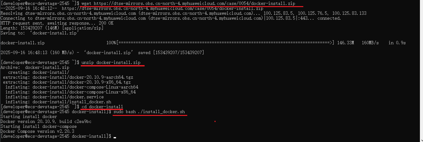 在云开发环境中下载并解压 docker 环境安装包。