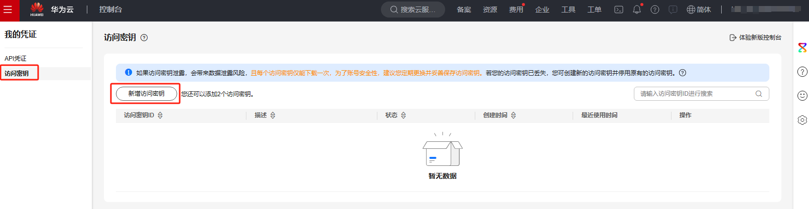 客户端配置华为云账号的密钥(AK/SK)信息(AK 是 Access Key ID,SK 是 Secret Access Key),在开华为云控制台我的凭证页面创建访问密钥,可以参考获取AK/SK文档。