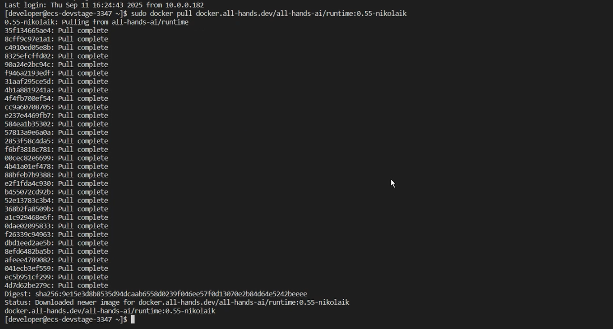 远程连接到云开发环境后,在云开发环境中安装 OpenHands。