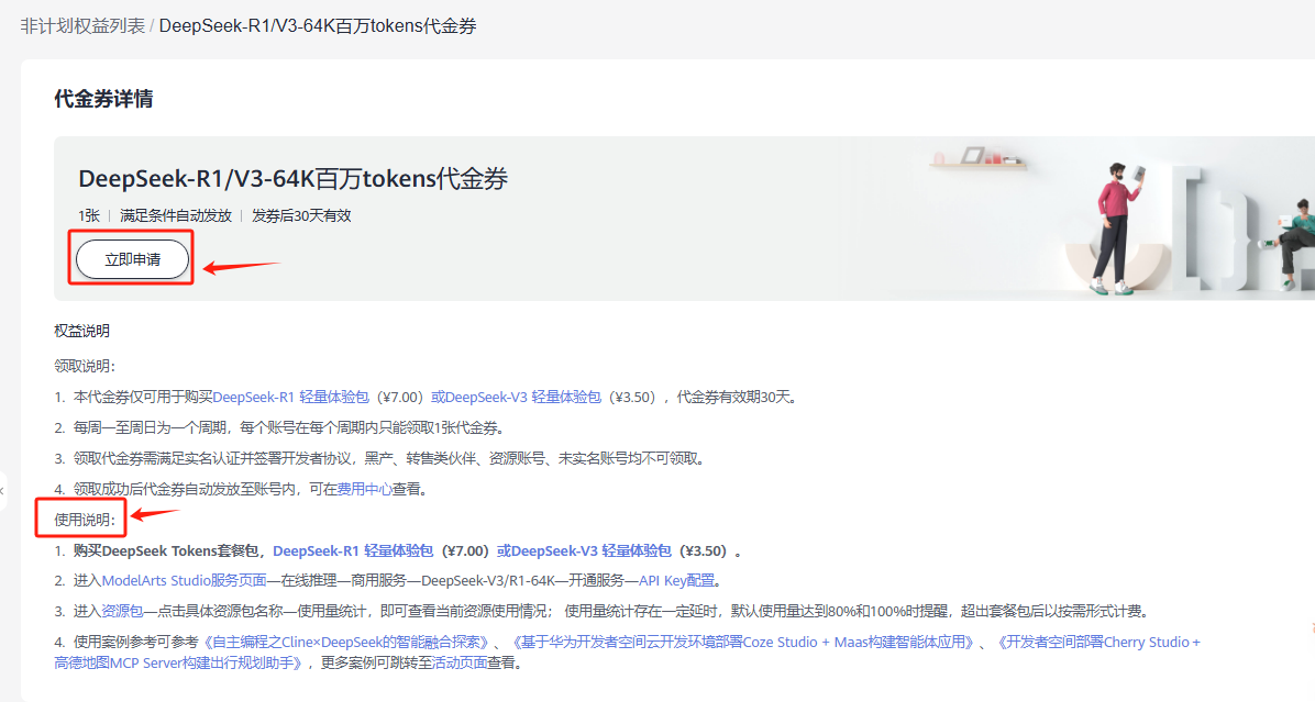 领取代金券开通华为云 MaaS DeepSeek-R1 服务;