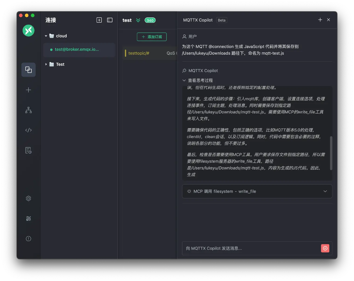 @connection关键词提取当前连接详情。要求 Copilot "为这个 MQTT @connection 生成 JavaScript 代码并将其保存到 /Users/username/Downloads 路径下,命名为 mqtt-test.js"。