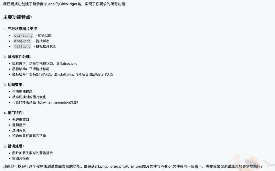 Prompt:创建一个继承自 QLabel 的 GirlWidget 类,实现桌面女友的初始化、鼠标事件处理以及动画效果,女友有三种状态图片,分别是 start.png、drag.png 和 fall.png,分别对应初始状态、拖拽状态和鼠标松开状态,鼠标松开 3s 后回归初始状态,要实现拖拽时形象动态变化和平滑移动。