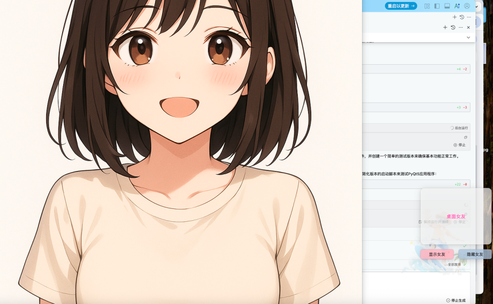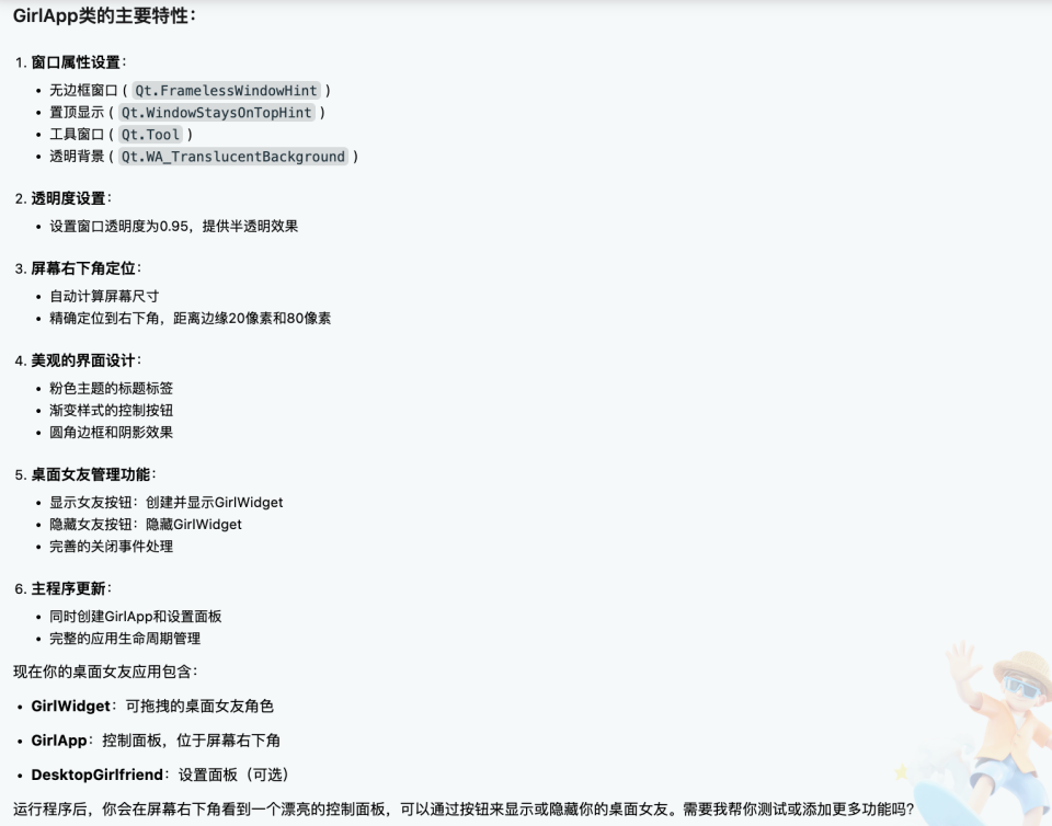 Prompt:创建一个继承自 QWidget 的 GirlApp 类,初始化桌面女友的界面,设置窗口透明度、置顶和背景透明,将桌面女友显示在屏幕右下角。