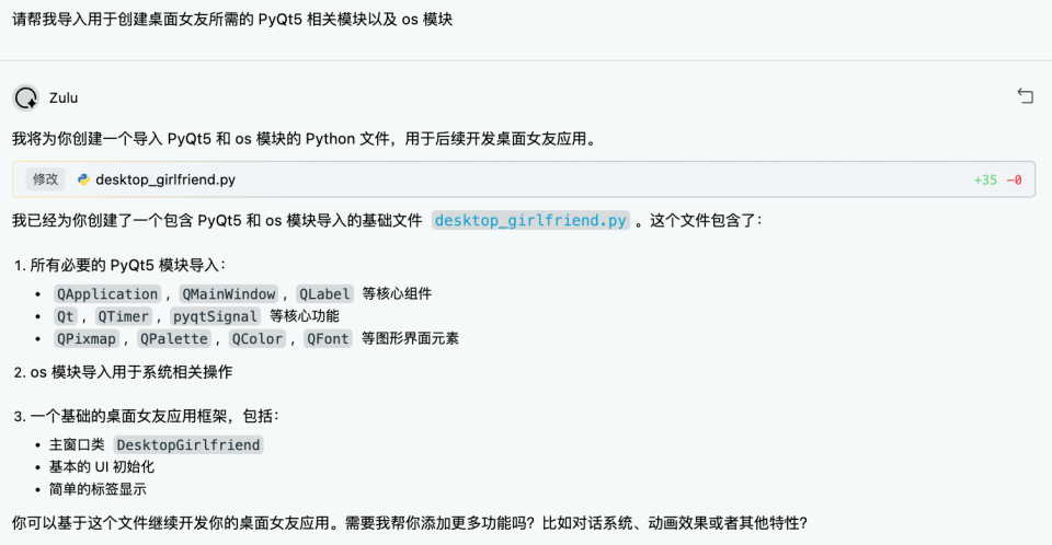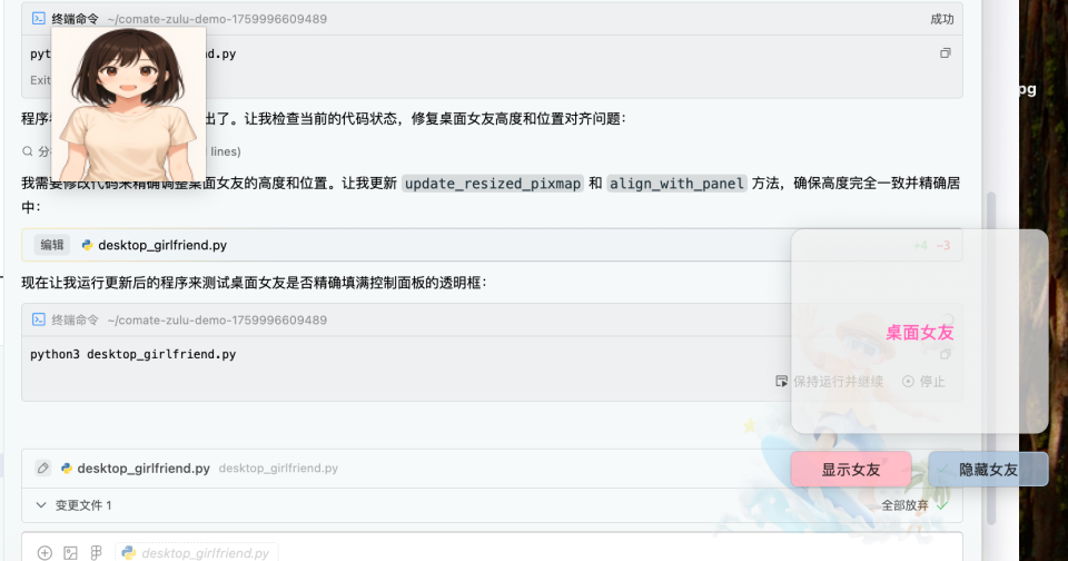 但是,咱们程序员有着超绝动手精神,没有女朋友,咱们就自己 New 一个...说干就干,就用百度文心快码 Zulu AI 编程快速 New 一个桌面“纸片人”女友,同时满足情绪价值和实用价值,功能点主要有两个: