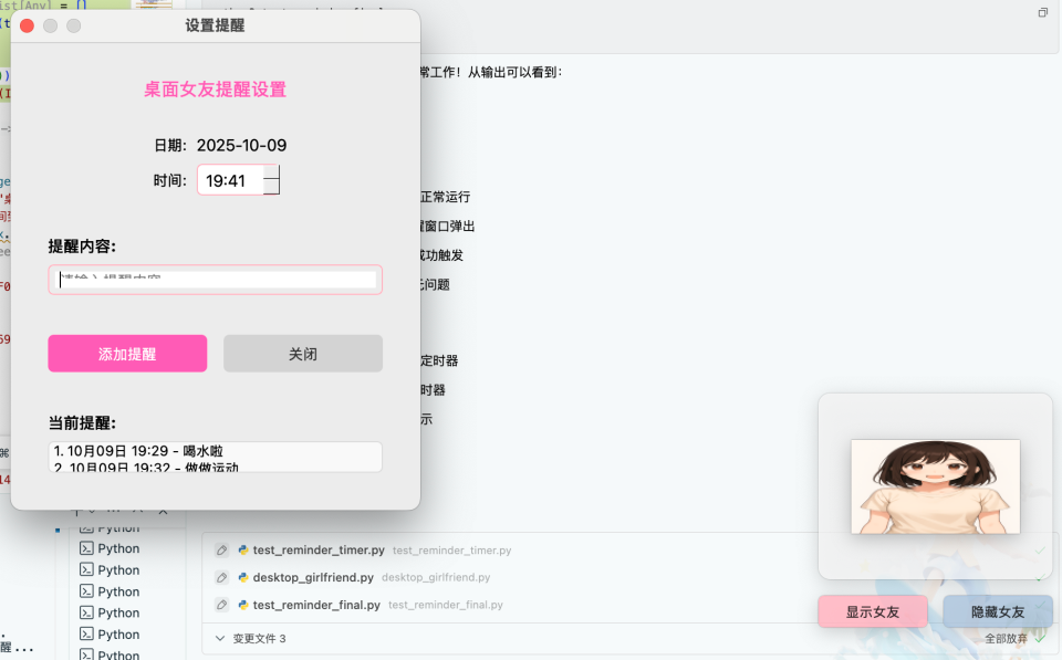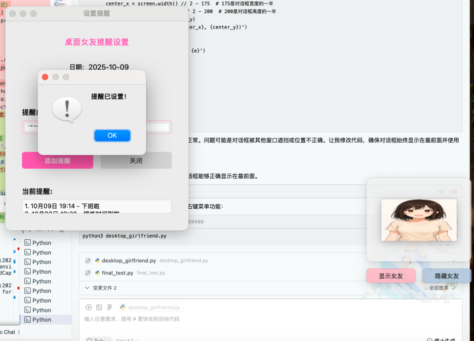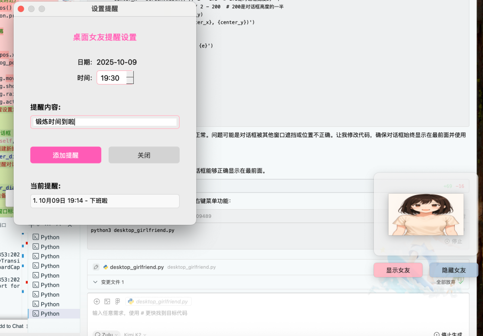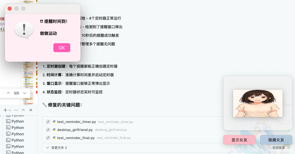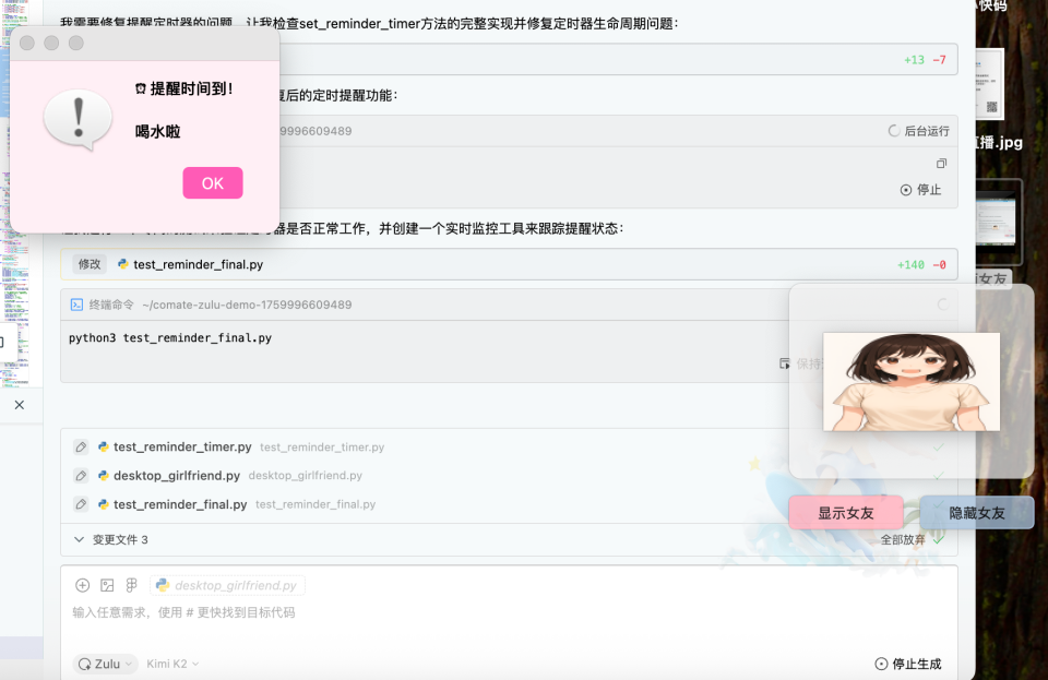 如果你对这个实践感兴趣,可以在此基础上做更多小创新,比如尝试更多动态行为(让桌面女友做出更多可爱动作),尝试音频交互(比如在弹出提醒时用闹铃声+人声提醒)...提醒功能也可以结合更多生活场景和诉求,比如背单词提醒、健康小助手(提示喝水、运动)、备忘录提示等。